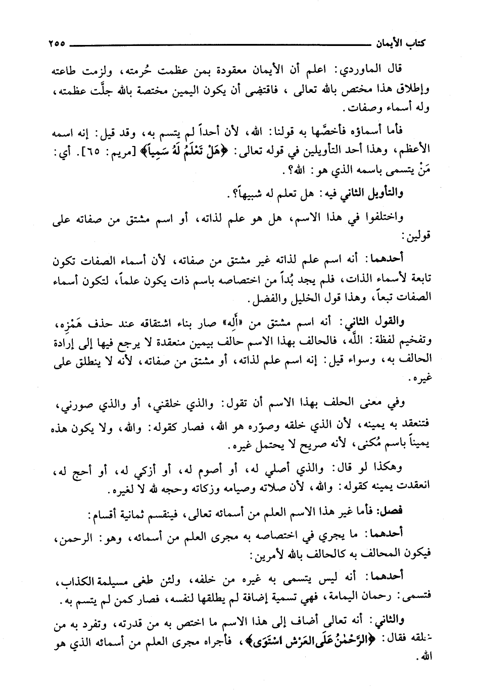 قَالَ الْمَاوَرْدِيُّ: اعْلَمْ أَنَّ الْأَيْمَانَ مَعْقُودَةٌ بِمَنْ عَظُمَتْ حُرْمَتُهُ، وَلَزِمَتْ طَاعَتُهُ وَإِطْلَاقُ هَذَا مُخْتَصٌّ بِاللَّهِ تَعَالَى، فَاقْتَضَى أَنْ يَكُونَ الْيَمِينُ مُخْتَصَّةً بِاللَّهِ جَلَّتْ عَظَمَتُهُ، وَلَهُ أَسْمَاءٌ وَصَفَاتٌ.