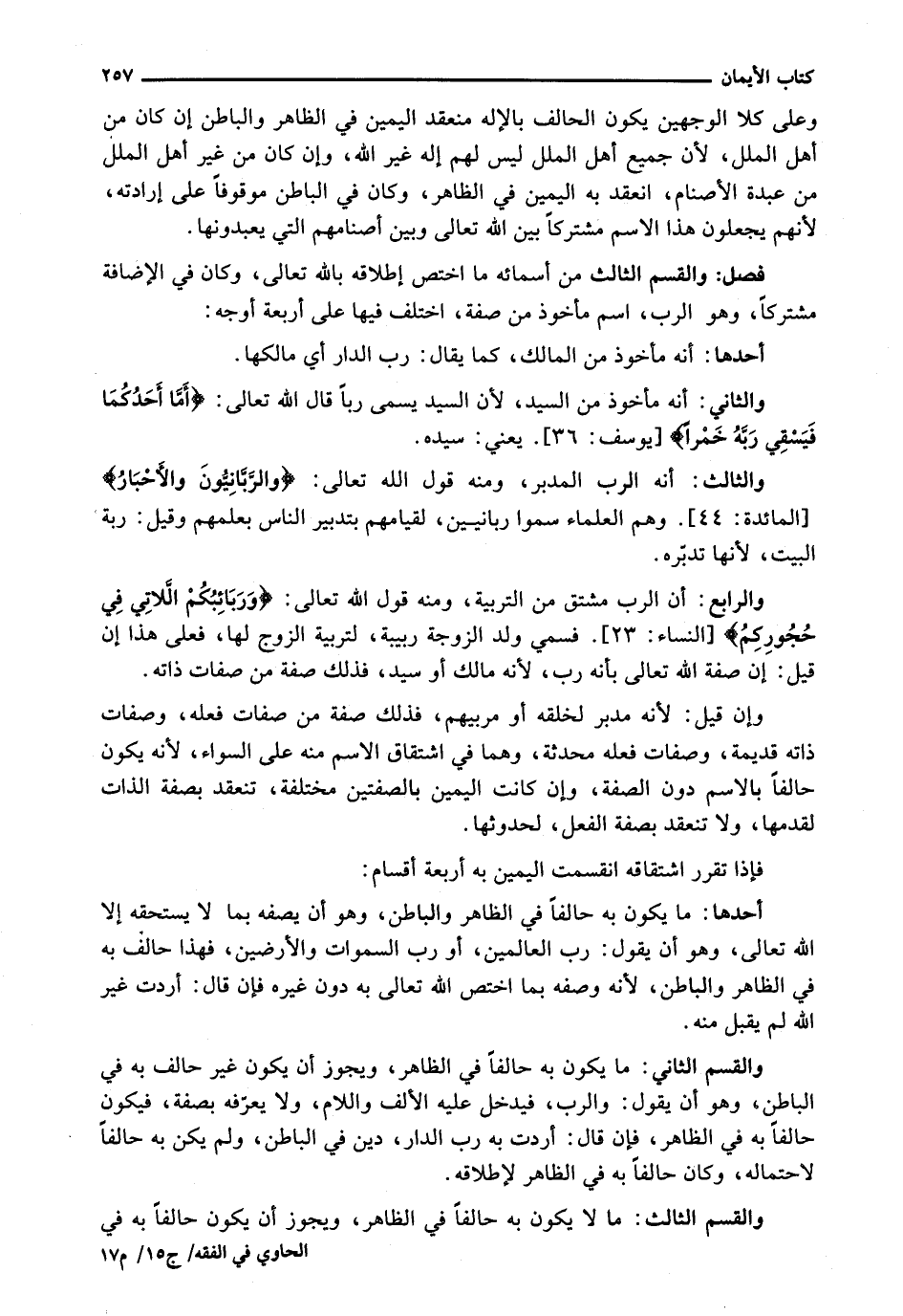 أَحَدُهَا: مَا يَكُونُ بِهِ حَالِفًا فِي الظَّاهِرِ وَالْبَاطِنِ، وَهُوَ أَنْ يَصِفَهُ بِمَا لَا يَسْتَحِقُّهُ إِلَّا اللَّهُ تَعَالَى، وَهُوَ أَنْ يَقُولَ: رَبُّ العالمين، أو رب السموات وَالْأَرْضِينَ، فَهَذَا حَالِفٌ بِهِ فِي الظَّاهِرِ وَالْبَاطِنِ، لِأَنَّهُ وَصَفَهُ بِمَا اخْتَصَّ اللَّهُ تَعَالَى بِهِ دُونَ غَيْرِهِ فَإِنْ قَالَ: أَرَدْتُ غَيْرَ اللَّهِ لَمْ يُقْبَلْ مِنْهُ.