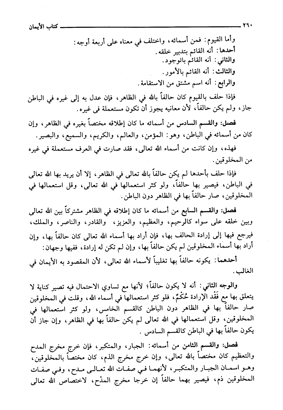 وَالْقِسْمُ السَّادِسُ: مِنْ أَسْمَائِهِ مَا كَانَ إِطْلَاقُهُ مُخْتَصًّا بِغَيْرِهِ فِي الظَّاهِرِ، وَإِنْ كَانَ مِنْ أَسْمَائِهِ فِي الْبَاطِنِ، وَهُوَ: الْمُؤْمِنُ، وَالْعَالِمُ، وَالْكَرِيمُ، وَالسَّمِيعُ، وَالْبَصِيرُ.