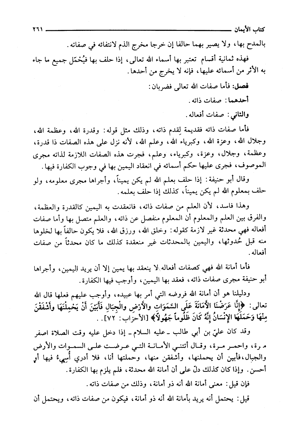 وَقَدْ كَانَ عَلِيُّ بْنُ أَبِي طَالِبٍ - عَلَيْهِ السَّلَامُ - إِذَا دَخَلَ عَلَيْهِ وَقْتُ الصَّلَاةِ اصْفَرَّ مَرَّةً، وَاحْمَرَّ مَرَّةً، وَقَالَ أَتَتْنِي الْأَمَانَةُ الَّتِي عرضت على السموات وَالْأَرْضِ وَالْجِبَالِ، فَأَبَيْنَ أَنْ يَحْمِلْنَهَا، وَأَشْفَقْنَ مِنْهَا، وَحَمَلْتُهَا أَنَا، فَلَا أَدْرِي أسيءُ فِيهَا أَوْ أُحْسِنُ. وَإِذَا كَانَ كَذَلِكَ دَلَّ عَلَى أَنَّ أَمَانَةَ اللَّهِ مُحْدَثَةٌ، فَلَمْ يَلْزَمْ بِهَا الْكَفَّارَةُ.
