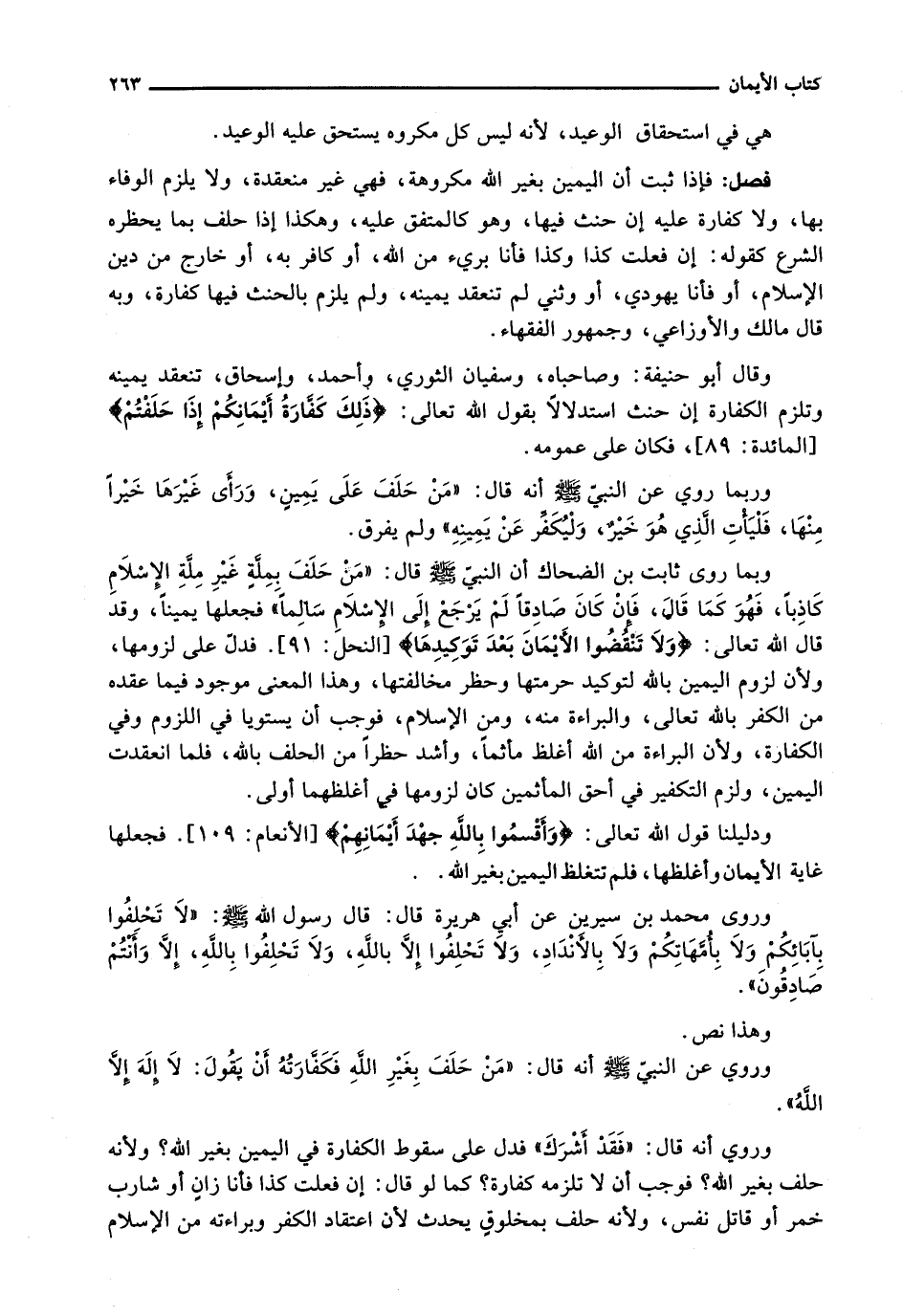 وَرُوِيَ عَنِ النَّبِيِّ - صَلَّى اللَّهُ عَلَيْهِ وَسَلَّم َ - أنه قال: " من خلف بِغَيْرِ اللَّهِ فَكَفَّارَتُهُ أَنْ يَقُولَ: لَا إِلَهَ إِلَّا اللَّهُ ".