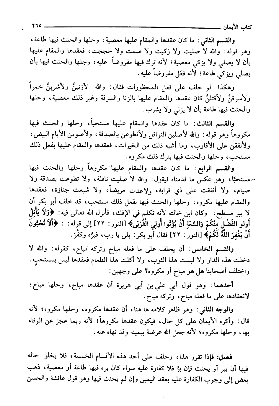 وَالْقِسْمُ الثَّانِي: مَا كَانَ عَقْدُهَا وَالْمَقَامُ عَلَيْهَا مَعْصِيَةً، وَحَلُّهَا وَالْحِنْثُ فِيهَا طَاعَةً، وَهُوَ قَوْلُهُ: وَاللَّهِ لَا صَلَّيْتُ وَلَا زَكَّيْتُ وَلَا صُمْتُ وَلَا حَجَجْتُ، فَعَقْدُهَا وَالْمَقَامُ عَلَيْهَا بِأَنْ لَا يُصَلِّيَ وَلَا يُزَكِّيَ مَعْصِيَةٌ؛ لِأَنَّهُ تَرَكَ فِيهَا مفروضاً عليه، وجلها وَالْحِنْثُ فِيهَا بِأَنْ يُصَلِّيَ وَيُزَكِّيَ طَاعَةٌ؛ لِأَنَّهُ فَعَلَ مَفْرُوضًا عَلَيْهِ.