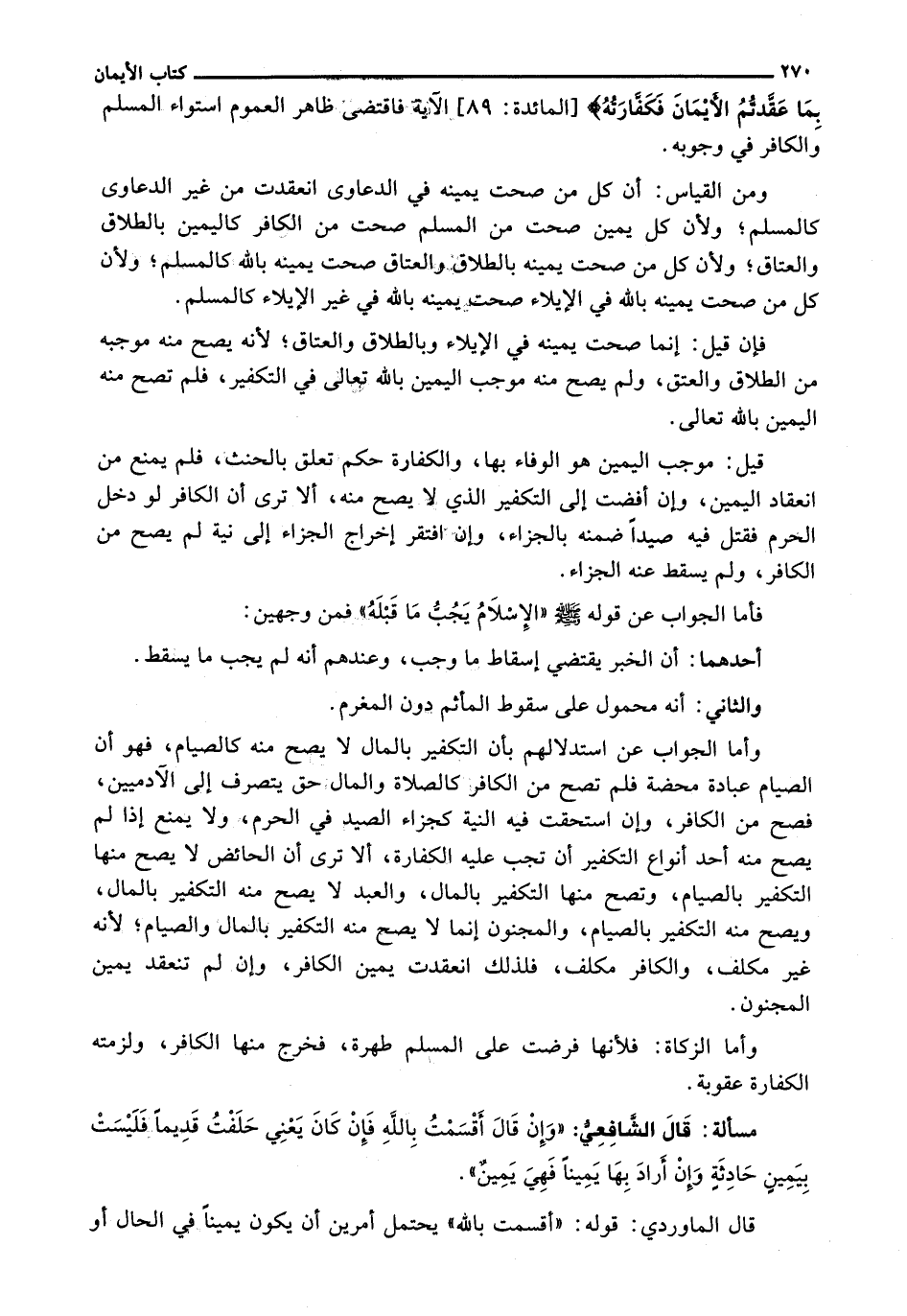 قِيلَ: مُوجِبُ الْيَمِينِ هُوَ الْوَفَاءُ بِهَا، وَالْكَفَّارَةُ حُكْمٌ تَعَلَّقَ بِالْحِنْثِ، فَلَمْ يَمْنَعْ مِنَ انْعِقَادِ الْيَمِينِ، وَإِنْ أَفْضَتْ إِلَى التَّكْفِيرِ الَّذِي لَا يَصِحُّ مِنْهُ، أَلَا تَرَى أَنَّ الْكَافِرَ لَوْ دَخَلَ الْحَرَمَ فَقَتَلَ فِيهِ صَيْدًا ضَمِنَهُ بِالْجَزَاءِ، وَإِنِ افْتَقَرَ إِخْرَاجُ الْجَزَاءِ إِلَى نِيَّةٍ لَمْ يَصِحَّ مِنَ الْكَافِرِ، وَلَمْ يَسْقُطْ عَنْهُ الْجَزَاءُ.