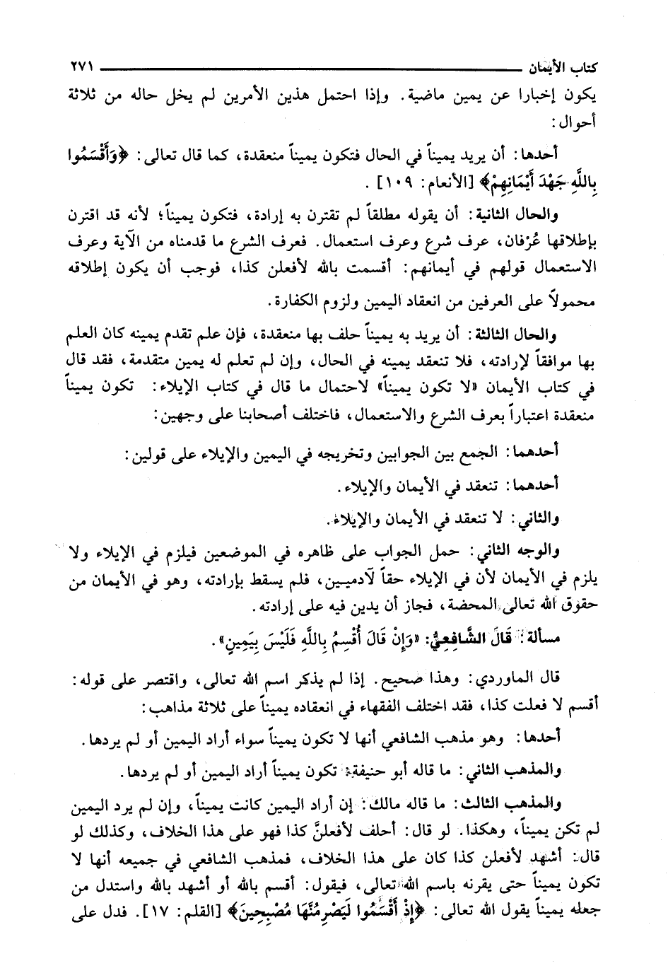 قَالَ الماوري: وَهَذَا صَحِيحٌ. إِذَا لَمْ يَذْكُرِ اسْمَ اللَّهِ تَعَالَى، وَاقْتَصَرَ عَلَى قَوْلِهِ: أُقْسِمُ لَا فَعَلْتُ كَذَا، فَقَدِ اخْتَلَفَ الْفُقَهَاءُ فِي انْعِقَادِهِ يَمِينًا عَلَى ثَلَاثَةِ مَذَاهِبَ: