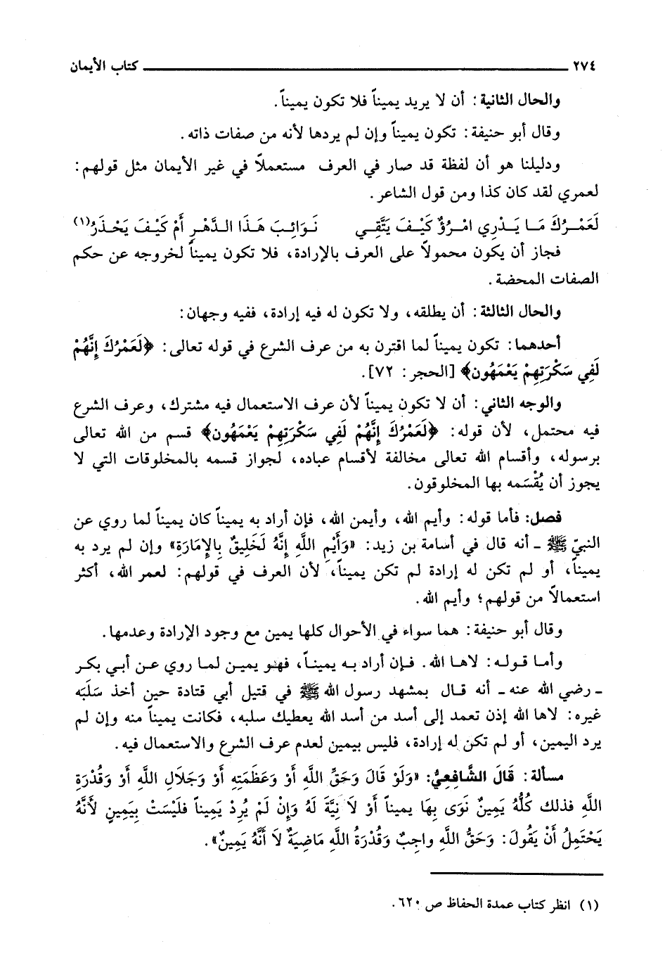 وَالْوَجْهُ الثَّانِي: أَنْ لَا تَكُونَ يَمِينًا لِأَنَّ عُرْفَ الِاسْتِعْمَالِ فِيهِ مُشْتَرَكٌ، وَعُرْفَ الشَّرْعِ فِيهِ مُحْتَمَلٌ، لِأَنَّ قَوْلَهُ: {لَعَمْرُكَ إِنَّهُمْ لَفِي سَكْرَتِهِمْ يَعْمَهُونَ} قَسَمٌ مِنَ اللَّهِ تَعَالَى بِرَسُولِهِ، وَأَقْسَامُ اللَّهِ تَعَالَى مُخَالِفَةٌ لِأَقْسَامِ عِبَادِهِ، لِجَوَازِ قَسَمِهِ بِالْمَخْلُوقَاتِ التي لا يجوز أن يقسمه بِهَا الْمَخْلُوقُونَ.