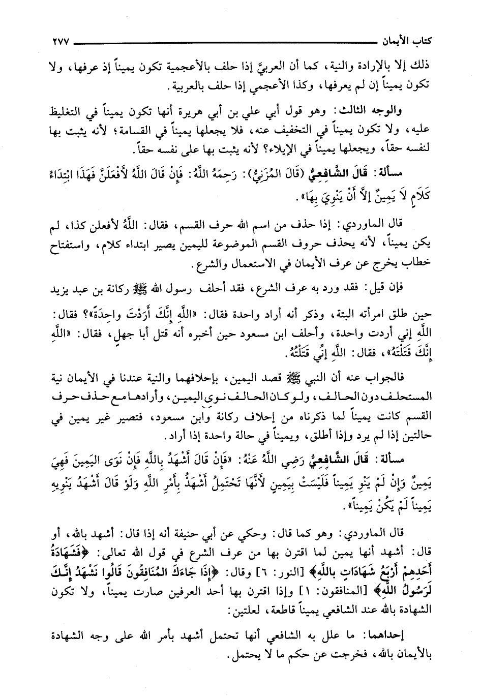 قَالَ الْمَاوَرْدِيُّ: وَهُوَ كَمَا قَالَ: وَحُكِيَ عَنْ أَبِي حَنِيفَةَ أَنَّهُ إِذَا قَالَ: أَشْهَدُ بِاللَّهِ، أَوْ قَالَ: أَشْهَدُ أَنَّهَا يَمِينٌ لِمَا اقْتَرَنَ بِهَا مِنْ عُرْفِ الشَّرْعِ فِي قَوْلِ اللَّهِ تَعَالَى: {فَشَهَادَةُ أَحَدِهِمْ أَرْبَعُ شَهَادَاتٍ بِاللهِ) {النور: 6) وَقَالَ: {إِذَا جَاءَكَ المُنَافِقُونَ قَالُوا نَشْهَدُ إِنَّكَ لَرَسُولُ اللهِ) {المنافقون: 1) وَإِذَا اقْتَرَنَ بِهَا أَحَدُ الْعُرْفَيْنِ صَارَتْ يَمِينًا، وَلَا تَكُونُ الشَّهَادَةُ بِاللَّهِ عِنْدَ الشَّافِعِيِّ يَمِينًا قَاطِعَةً، لِعِلَّتَيْنِ: