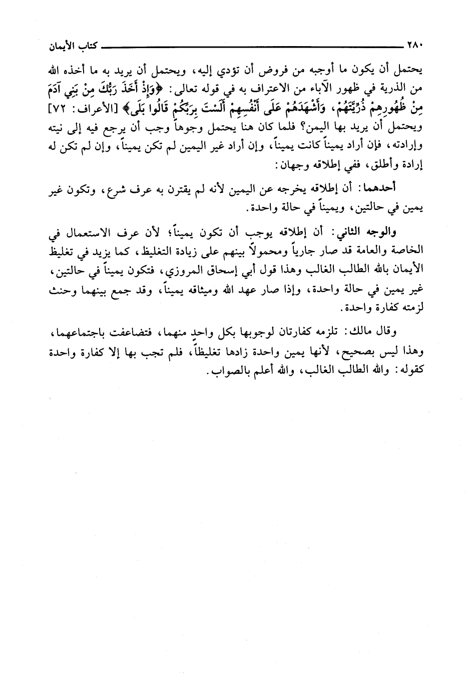 يَحْتَمِلُ أَنْ يَكُونَ مَا أَوْجَبَهُ مِنْ فُرُوضٍ أَنْ تُؤَدَّى إِلَيْهِ، وَيُحْتَمَلُ أَنْ يُرِيدَ بِهِ مَا أَخَذَهُ اللَّهُ مِنَ الذُّرِّيَّةِ فِي ظُهُورِ الْآبَاءِ مِنَ الِاعْتِرَافِ بِهِ فِي قَوْله تَعَالَى: {وِإذْ أخَذَ رَبُّكَ مِنْ بَنِي آدَمَ مِنْ ظُهُورِهِمْ ذُرِّيَّتَهُمْ، وَأَشْهَدَهُمْ عَلَى أَنْفُسِهِمْ أَلَسْتَ بِرَبِّكُمْ قَالُوا بَلَى) {الأعراف: 72) . وَيُحْتَمَلُ أَنْ يُرِيدَ بِهَا اليمن؟ فَلَمَّا كَانَ هُنَا يَحْتَمِلُ وُجُوهًا وَجَبَ أَنْ يُرْجَعَ فِيهِ إِلَى نِيَّتِهِ وَإِرَادَتِهِ، فَإِنْ أَرَادَ يَمِينًا كَانَتْ يَمِينًا، وَإِنْ أَرَادَ غَيْرَ الْيَمِينِ لَمْ تَكُنْ يَمِينًا، وَإِنْ لَمْ تَكُنْ لَهُ إِرَادَةٌ وَأَطْلَقَ، فَفِي إِطْلَاقِهِ وَجْهَانِ: