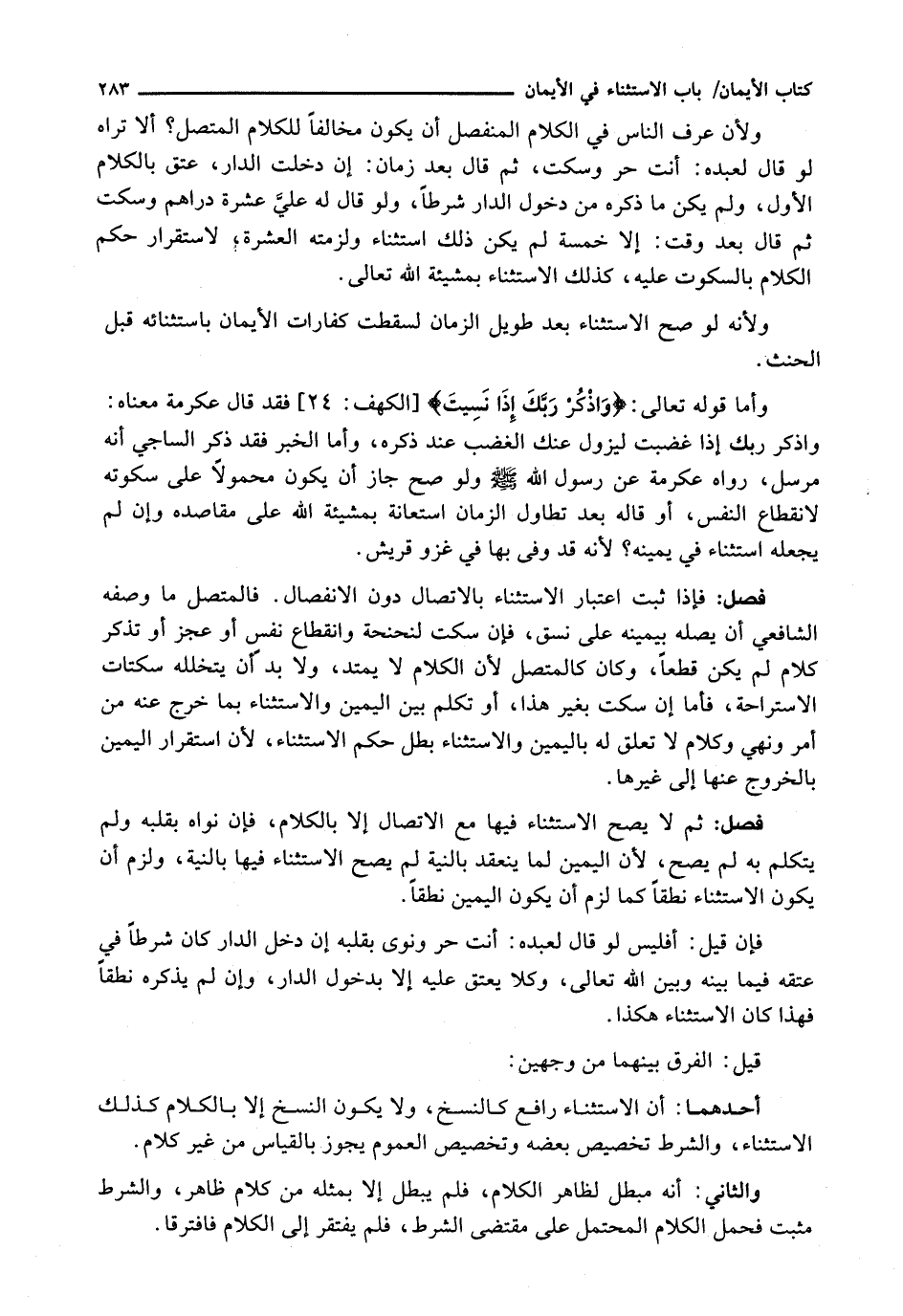 وَأَمَّا قَوْله تَعَالَى: {وَاذْكُرْ رَبَّكَ إِذَا نَسِيْتَ) {الكهف: 24) فَقَدْ قَالَ عِكْرِمَةُ مَعْنَاهُ: وَاذْكُرْ رَبَّكَ إِذَا غَضِبْتَ لِيَزُولَ عَنْكَ الْغَضَبُ عِنْدَ ذِكْرِهِ، وَأَمَّا الْخَبَرُ فَقَدْ ذَكَرَ السَّاجِيُّ أَنَّهُ مُرْسَلٌ، رَوَاهُ عِكْرِمَةُ عَنْ رَسُولِ اللَّهِ - صَلَّى اللَّهُ عَلَيْهِ وَسَلَّم َ - ولو صح جاز أن يَكُونَ مَحْمُولًا عَلَى سُكُوتِهِ لِانْقِطَاعِ النَّفَسِ، أَوْ قَالَهُ بَعْدَ تَطَاوُلِ الزَّمَانِ اسْتِعَانَةً بِمَشِيئَةِ اللَّهِ عَلَى مَقَاصِدِهِ وَإِنْ لَمْ يَجْعَلْهُ اسْتِثْنَاءً فِي يَمِينِهِ؟ لِأَنَّهُ قَدْ وَفَّى بِهَا فِي غَزْوِ قُرَيْشٍ.