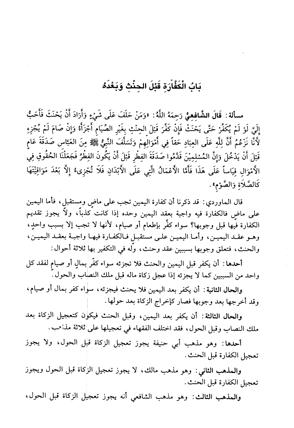 قَالَ الشَّافِعِيُّ: رَحِمَهُ اللَّهُ: " وَمَنْ حَلَفَ عَلَى شيءٍ وَأَرَادَ أَنْ يَحْنَثَ فَأَحَبُّ إِلَيَّ لَوْ لَمْ يُكَفِّرْ حَتَّى يَحْنَثَ فَإِنْ كَفَّرَ قَبْلَ الْحِنْثِ بِغَيْرِ الصِّيَامِ أَجْزَأَهُ وَإِنْ صَامَ لَمْ يُجْزِهِ لأنا نزعم أن لله على العباد حقاً في أموالهم وتسلف النبي - صَلَّى اللَّهُ عَلَيْهِ وَسَلَّم َ - من العباس صدقة عامٍ قبل أن يدخل وإن المسلمين قدموا صدقة الفطر قبل أن يكون الفطر فجعلنا الحقوق في الأموال قياساً على هذا فأما الأعمال التي على الأبدان فلا تجزئ إلا بعد مواقيتها كالصلاة والصوم ".