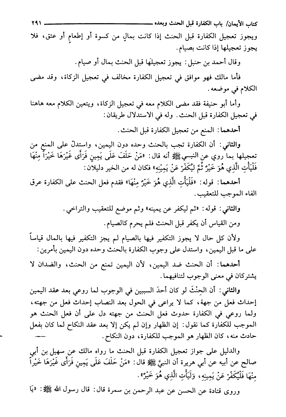 وَالدَّلِيلُ عَلَى جَوَازِ تَعْجِيلِ الْكَفَّارَةِ قَبْلَ الْحِنْثِ مَا رَوَاهُ مَالِكٌ عَنْ سُهَيْلِ بْنِ أَبِي صَالِحٍ عَنْ أَبِيهِ عَنْ أَبِي هُرَيْرَةَ أَنَّ النَّبِيَّ - صَلَّى اللَّهُ عَلَيْهِ وَسَلَّم َ - قَالَ: " مَنْ حَلَفَ عَلَى يمينٍ فَرَأَى غَيْرَهَا خَيْرًا مِنْهَا فَلْيُكَفِّرْ عَنْ يَمِينِهِ، وَلْيَأْتِ الَّذِي هُوَ خيرٌ ".