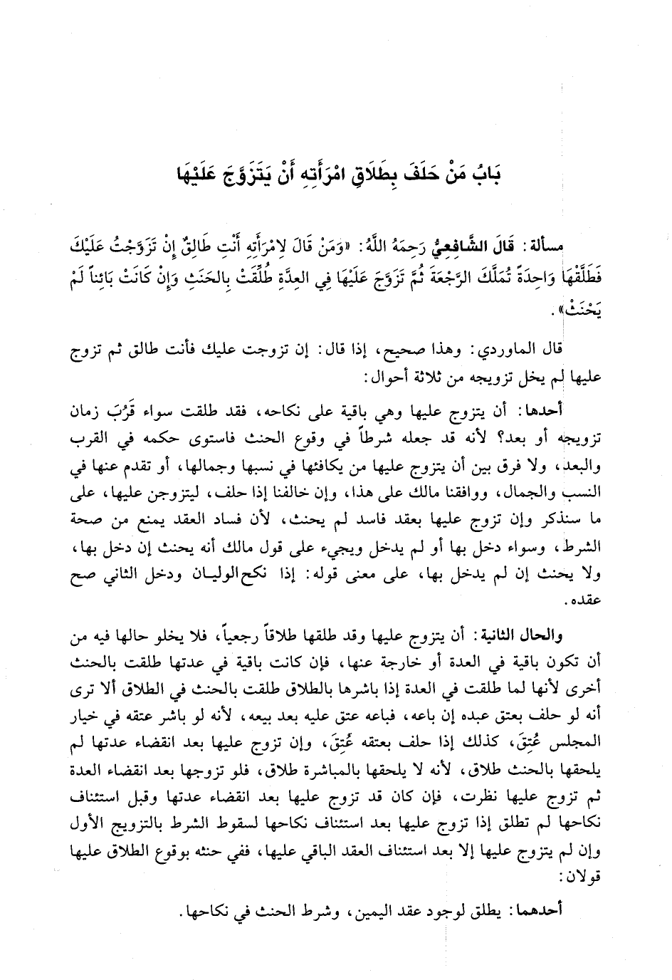وَالْحَالُ الثَّانِيَةُ: أَنْ يَتَزَوَّجَ عَلَيْهَا وَقَدْ طَلَّقَهَا طَلَاقًا رَجْعِيًّا، فَلَا يَخْلُو حَالُهَا فِيهِ مِنْ أَنْ تَكُونَ بَاقِيَةً فِي الْعِدَّةِ أَوْ خَارِجَةً عَنْهَا، فَإِنْ كَانَتْ بَاقِيَةً فِي عِدَّتِهَا طُلِّقَتْ بِالْحِنْثِ أُخْرَى لِأَنَّهَا لَمَّا طُلِّقَتْ فِي الْعِدَّةِ إِذَا بَاشَرَهَا بِالطَّلَاقِ طُلِّقَتْ بِالْحِنْثِ فِي الطَّلَاقِ أَلَا تَرَى أَنَّهُ لَوْ حَلَفَ بِعِتْقِ عَبْدِهِ إِنْ بَاعَهُ، فَبَاعَهُ عَتَقَ عَلَيْهِ بَعْدَ بَيْعِهِ، لِأَنَّهُ لَوْ بَاشَرَ عِتْقَهُ فِي خِيَارِ الْمَجْلِسِ عُتق، كَذَلِكَ إِذَا حَلَفَ بِعِتْقِهِ عَتَقَ، وَإِنْ تَزَوَّجَ عَلَيْهَا بَعْدَ انْقِضَاءِ عِدَّتِهَا لَمْ يَلْحَقْهَا بِالْحِنْثِ طَلَاقٌ، لِأَنَّهُ لَا يَلْحَقُهَا بِالْمُبَاشِرَةِ طَلَاقٌ، فَلَوْ تَزَوَّجَهَا بَعْدَ انْقِضَاءِ الْعِدَّةِ ثُمَّ تَزَوَّجَ عَلَيْهَا نُظِرَت، فَإِنْ كَانَ قَدْ تَزَوَّجَ عَلَيْهَا بَعْدَ انْقِضَاءِ عِدَّتِهَا وَقَبْلَ اسْتِئْنَافِ نِكَاحِهَا لَمْ تُطَلَّقْ إِذَا تَزَوَّجَ عَلَيْهَا بَعْدَ اسْتِئْنَافِ نِكَاحِهَا لِسُقُوطِ الشَّرْطِ بِالتَّزْوِيجِ الْأَوَّلِ وَإِنْ لَمْ يَتَزَوَّجْ عَلَيْهَا إِلَّا بَعْدَ اسْتِئْنَافِ الْعَقْدِ الْبَاقِي عَلَيْهَا، فَفِي حِنْثِهِ بِوُقُوعِ الطَّلَاقِ عَلَيْهَا قَوْلَانِ: