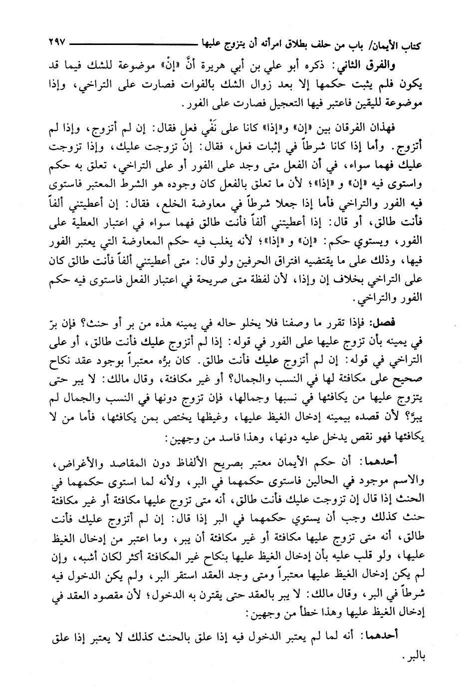 فَهَذَانِ الْفَرْقَانِ بَيْنَ " إِنْ " وَ " إِذَا " كَانَا عَلَى نَفْيِ فعلٍ فَقَالَ: إِنْ لَمْ أَتَزَوَّجْ، وَإِذَا لَمْ أَتَزَوَّجْ. وَأَمَّا إِذَا كَانَا شَرْطًا فِي إِثْبَاتِ فِعْلٍ، فَقَالَ: إِنْ تَزَوَّجْتُ عليك، وإذا تَزَوَّجْتُ عَلَيْكِ فَهُمَا سَوَاءٌ، فِي أَنَّ الْفِعْلَ مَتَى وُجِدَ عَلَى الْفَوْرِ أَوْ عَلَى التَّرَاخِي، تَعَلَّقَ بِهِ حُكْمٌ وَاسْتَوَى فِيهِ " إِنْ " وَ " إِذَا "؛ لِأَنَّ مَا تَعَلَّقَ بِالْفِعْلِ كَانَ وُجُودُهُ هُوَ الشَّرْطَ الْمُعْتَبَرَ فَاسْتَوَى فِيهِ الْفَوْرُ وَالتَّرَاخِي فَأَمَّا إِذَا جُعِلَا شَرْطًا فِي مُعَاوَضَةِ الْخُلْعِ، فَقَالَ: إِنْ أَعْطَيْتِنِي أَلْفًا فَأَنْتِ طَالِقٌ، أَوْ قَالَ: إِذَا أَعْطَيْتِنِي أَلْفًا فَأَنْتِ طَالِقٌ فَهُمَا سَوَاءٌ فِي اعْتِبَارِ الْعَطِيَّةِ عَلَى الْفَوْرِ، وَيَسْتَوِي حُكْمُ: " إِنْ " وَ " إِذَا "؛ لِأَنَّهُ يَغْلِبُ فِيهِ حِكَمُ الْمُعَاوَضَةِ الَّتِي يُعْتَبَرُ الْفَوْرُ فِيهَا، وَذَلِكَ عَلَى مَا يَقْتَضِيهِ افْتِرَاقُ الْحَرْفَيْنِ وَلَوْ قَالَ: مَتَى أَعْطَيْتِنِي أَلْفًا فَأَنْتِ طَالِقٌ كَانَ عَلَى التراخي بخلاف إن وإذا، لِأَنَّ لَفْظَةَ مَتَى صَرِيحَةٌ فِي اعْتِبَارِ الْفِعْلِ فَاسْتَوَى فِيهِ حُكْمُ الْفَوْرِ وَالتَّرَاخِي.