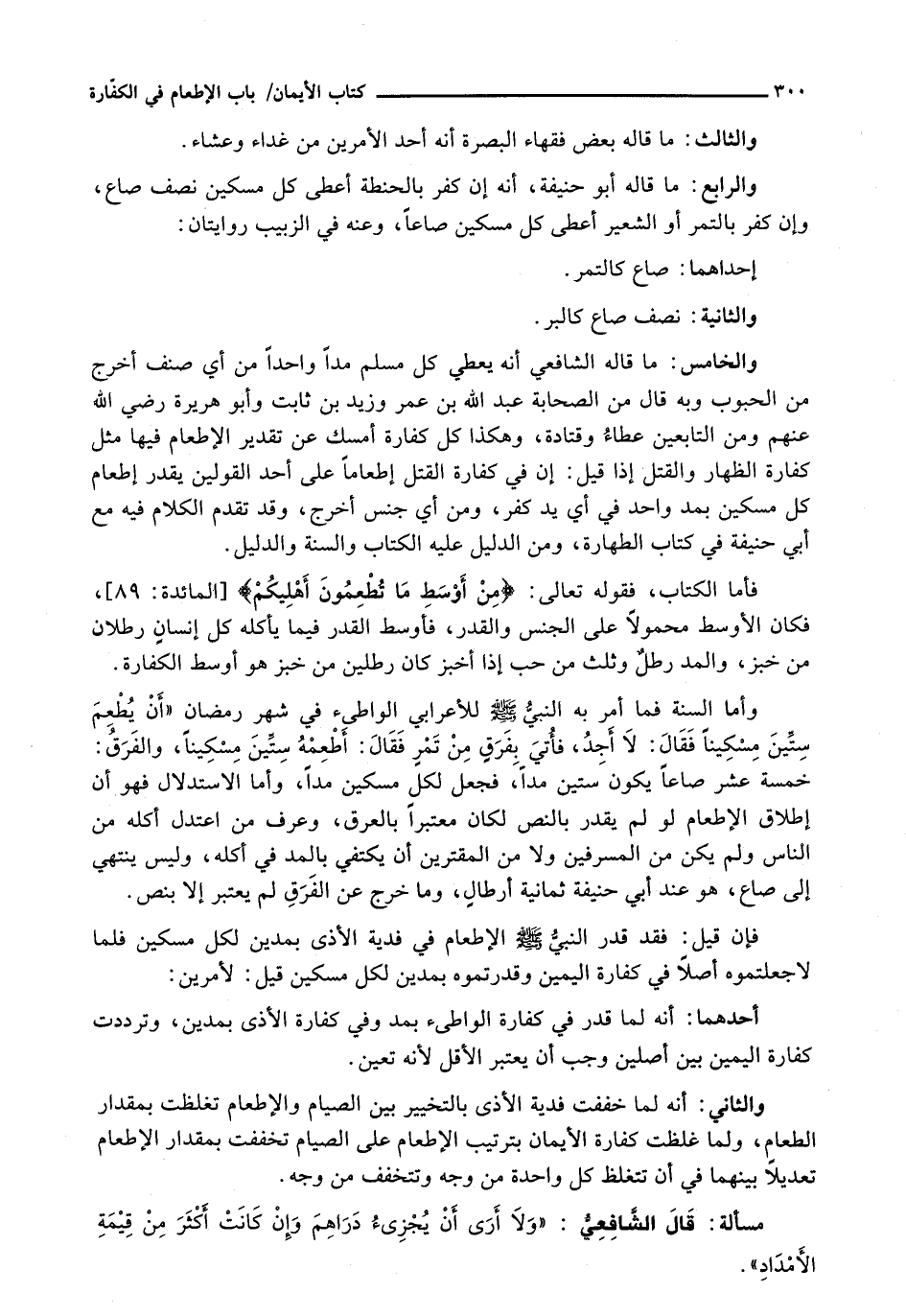 فَأَمَّا الْكِتَابُ، فَقَوْلُهُ تَعَالَى: {مِنْ أَوْسَطِ مَا تُطْعِمُونَ أَهْلِيكُمْ) {المائدة: 89) ، فَكَانَ الْأَوْسَطُ مَحْمُولًا عَلَى الْجِنْسِ وَالْقَدْرِ، فَأَوْسَطُ الْقَدْرِ فِيمَا يَأْكُلُهُ كُلُّ إنسانٍ رِطْلَانِ مِنْ خُبْزٍ، وَالْمُدُّ رطلٌ وَثُلُثٌ من حب إذا أخبز كان رطلين مِنْ خُبْزٍ هُوَ أَوْسَطَ الْكَفَّارَةِ.