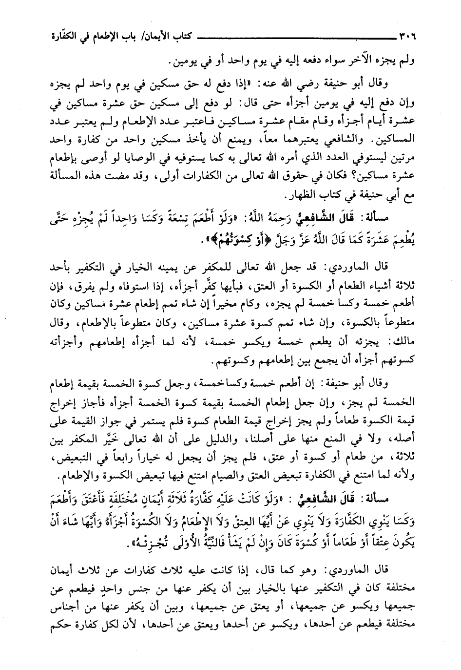 قَالَ الْمَاوَرْدِيُّ: قَدْ جَعَلَ اللَّهُ تَعَالَى لِلْمُكَفِّرِ عَنْ يَمِينِهِ الْخِيَارَ فِي التَّكْفِيرِ بِأَحَدِ ثَلَاثَةِ أشياء الطعام أو الكسوة أو العتق، فبأيهما كَفَّرَ أَجَزْأَهُ، إِذَا اسْتَوْفَاهُ وَلَمْ يُفَرِّقْ، فَإِنْ أَطْعَمَ خَمْسَةً وَكَسَا خَمْسَةً لَمْ يُجْزِهِ، وَكَانَ مُخَيَّرًا إِنْ شَاءَ تَمَّمَ إِطْعَامَ عَشَرَةِ مَسَاكِينَ، وَكَانَ مُتَطَوِّعًا بِالْكِسْوَةِ، وَإِنْ شَاءَ تَمَّمَ كِسْوَةَ عَشَرَةِ مَسَاكِينَ، وَكَانَ مُتَطَوِّعًا بِالْإِطْعَامِ، وَقَالَ مَالِكٌ: يُجْزِئُهُ أَنْ يُطْعِمَ خَمْسَةً وَيَكْسُوَ خَمْسَةً، لِأَنَّهُ لَمَّا أَجْزَأَهُ إِطْعَامُهُمْ وَأَجْزَأَتْهُ كِسْوَتُهُمْ أَجْزَأَهُ أَنْ يَجْمَعَ بَيْنَ إِطْعَامِهِمْ وَكَسَوْتِهِمْ.