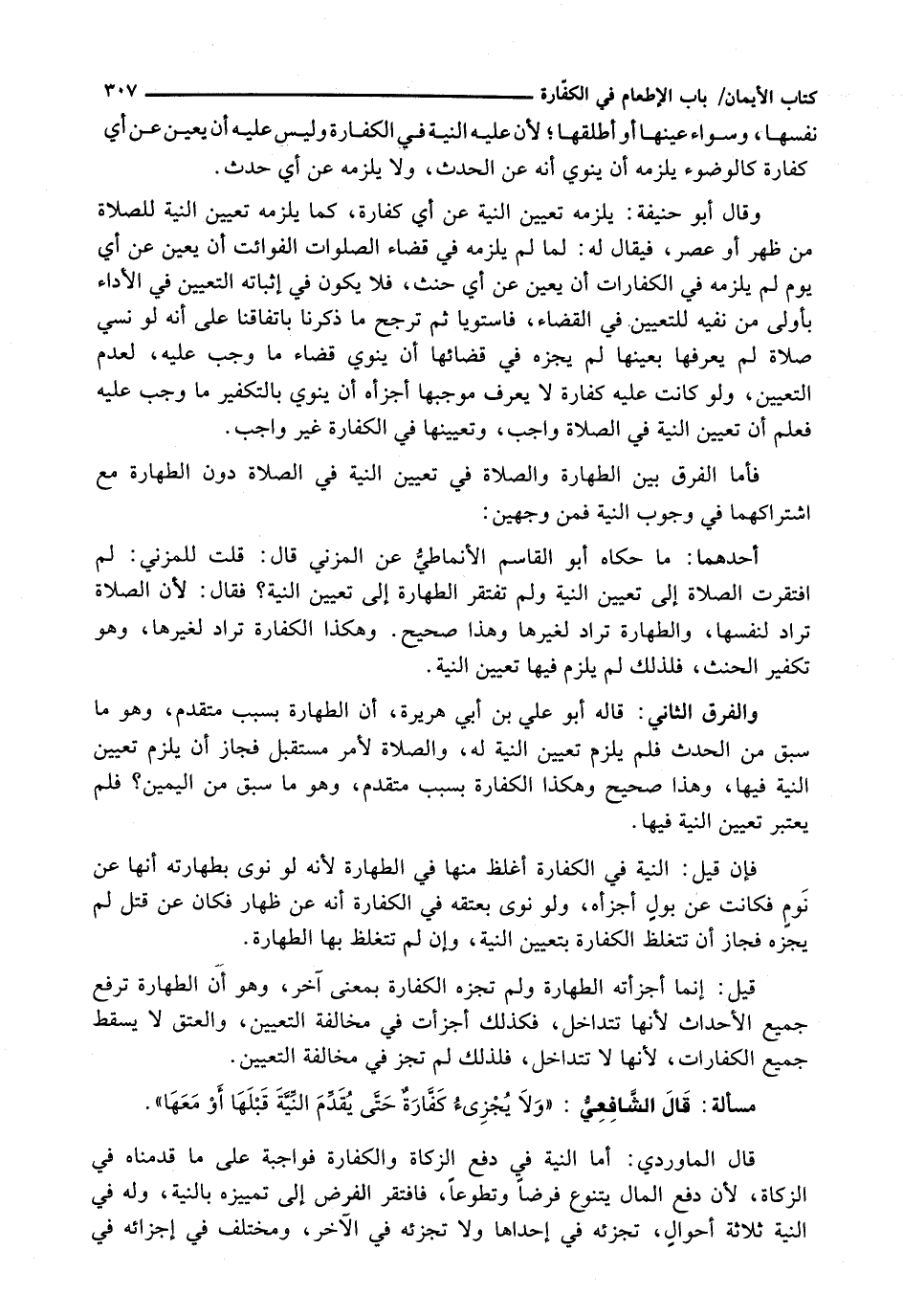 فَإِنْ قِيلَ: النِّيَّةُ فِي الْكَفَّارَةِ أَغْلَظُ مِنْهَا فِي الطَّهَارَةِ لِأَنَّهُ لَوْ نَوَى بِطَهَارَتِهِ أَنَّهَا عَنْ نومٍ فَكَانَتْ عَنْ بولٍ أَجْزَأَهُ، وَلَوْ نَوَى بِعِتْقِهِ فِي الْكَفَّارَةِ أَنَّهُ عَنْ ظِهَارٍ فَكَانَ عَنْ قَتْلٍ لَمْ يُجْزِهِ فَجَازَ أَنْ تَتَغَلَّظَ الْكَفَّارَةُ بِتَعْيِينِ النِّيَّةِ، وَإِنْ لَمْ تَتَغَلَّظْ بِهَا الطَّهَارَةُ.