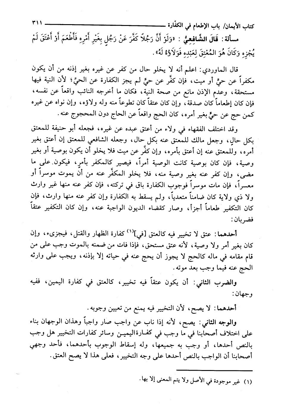 أَحَدُهُمَا: عِتْقٌ لَا تَخْيِيرَ فِيهِ كَالْعِتْقِ فِي كَفَّارَةِ الظِّهَارِ وَالْقَتْلِ، فَيُجْزِئُ، وَإِنْ كَانَ بِغَيْرِ أَمْرٍ وَلَا وَصِيَّةٍ، لِأَنَّهُ عِتْقٌ مُسْتَحَقٌّ، فَإِذَا فَاتَ مَنْ ضَمِنَهُ بِالْمَوْتِ وَجَبَ عَلَى مَنْ قَامَ مَقَامَهُ فِي مَالِهِ كَالْحَجِّ لَا يَجُوزُ أَنْ يَحُجَّ عَنْهُ فِي حَيَاتِهِ إِلَّا بِإِذْنِهِ، وَيَجِبُ عَلَى وَارِثِهِ الْحَجُّ عَنْهُ فِيمَا وَجَبَ بَعْدَ مَوْتِهِ.
