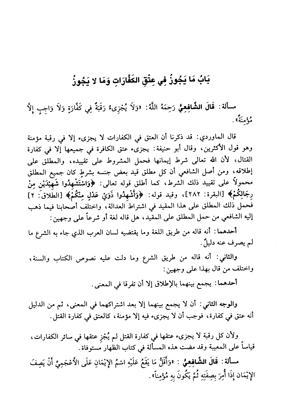 قَالَ الْمَاوَرْدِيُّ: قَدْ ذَكَرْنَا أَنَّ الْعِتْقَ فِي الْكَفَّارَاتِ لَا يُجْزِئُ إِلَّا فِي رَقَبَةٍ مُؤْمِنَةٍ وَهُوَ قَوْلُ الْأَكْثَرِينَ، وَقَالَ أَبُو حَنِيفَةَ: يُجْزِئُ عِتْقُ الكافرة في جمعيها إِلَّا فِي كَفَّارَةِ الْقِتَالِ، لِأَنَّ اللَّهَ تَعَالَى شَرَطَ إِيمَانَهَا فَحُمِلَ الْمَشْرُوطُ عَلَى تَقْيِيدِهِ، وَالْمُطْلَقُ عَلَى إِطْلَاقِهِ، وَمِنْ أَصْلِ الشَّافِعِيِّ أَنَّ كُلَّ مُطْلَقٍ قُيِّدَ بَعْضُ جِنْسِهِ بشرطٍ كَانَ جَمِيعُ الْمُطْلَقِ مَحْمُولًا عَلَى تَقْيِيدِ ذَلِكَ الشَّرْطِ، كَمَا أُطْلِقَ قَوْله تَعَالَى: {وَاسْتَشْهِدُوا شَهِيدَيْنِ مِنْ رِجَالِكُمْ) {البقرة: 282) ، وَقَيَّدَ قَوْلَهُ: {وَأَشْهِدُوا ذَوَيْ عَدْلٍ مِنْكُمْ) {الطلاق: 2) فَحُمِلَ ذَلِكَ الْمُطْلَقُ عَلَى هَذَا الْمُقَيَّدِ فِي اشْتِرَاطِ الْعَدَالَةِ، وَاخْتَلَفَ أَصْحَابُنَا فِيمَا ذَهَبَ إِلَيْهِ الشَّافِعِيُّ مِنْ حَمْلِ الْمُطْلَقِ عَلَى الْمُقَيَّدِ، هَلْ قَالَهُ لُغَةً أَوْ شَرْعًا عَلَى وَجْهَيْنِ: