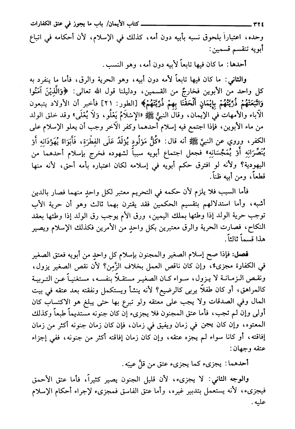 فَإِذَا صَحَّ إِسْلَامُ الصَّغِيرِ وَالْمَجْنُونِ بِإِسْلَامِ كُلٍّ واحدٍ مِنْ أَبَوَيْهِ فَعِتْقُ الصَّغِيرِ فِي الْكَفَّارَةِ مجزئٌ، وَإِنْ كَانَ نَاقِصَ الْعَمَلِ بِخِلَافِ الزَّمِنِ؟ لِأَنَّ نَقْصَ الصَّغِيرِ يَزُولُ، وَنَقْصِ الزَّمَانَةِ لَا يَزُولُ، سَوَاءٌ كَانَ الصَّغِيرُ مُسْتَقِلًّا بِنَفْسِهِ، مُسْتَغْنِيًا عَنِ التَّرْبِيَةِ كَالْمُرَاهِقِ، أَوْ كَانَ طِفْلًا يُرَبَّى كَالرَّضِيعِ؟ لِأَنَّهُ يَنْشَأُ وَيَسْتَكْمِلُ وَنَفَقَتُهُ بَعْدَ عِتْقِهِ فِي بَيْتِ الْمَالِ وَفِي الصَّدَقَاتِ وَلَا يَجِبُ عَلَى مُعْتِقِهِ وَلَوْ تَبَرَّعَ بِهَا حَتَّى يَبْلُغَ هُوَ الِاكْتِسَابَ كَانَ أَوْلَى وَإِنْ لَمْ تَجِبْ، فَأَمَّا عِتْقُ الْمَجْنُونِ فَلَا يُجْزِئُ إِنْ كَانَ جُنُونُهُ مُسْتَدِيمًا طَبْعًا وَكَذَلِكَ الْمَعْتُوهُ، وَإِنْ كَانَ يُجَنُّ فِي زَمَانٍ وَيُفِيقُ فِي زَمَانٍ، فَإِنْ كَانَ زَمَانُ جُنُونِهِ أَكْثَرَ مِنْ زَمَانِ إِفَاقَتِهِ، أَوْ كَانَا سَوَاءً لَمْ يُجْزِهِ عِتْقُهُ، وَإِنْ كَانَ زَمَانُ إِفَاقَتِهِ أَكْثَرَ مِنْ جُنُونِهِ، فَفِي إِجْزَاءِ عِتْقِهِ وَجْهَانِ:
