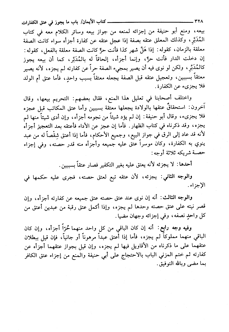 وَفِيهِ وَجْهٌ رَابِعٌ: إنَّهُ إِنْ كَانَ الْبَاقِي مِنْ كُلٍّ وَاحِدٍ مِنْهُمَا حُرًّا أَجْزَأَهُ، وَإِنْ كَانَ الْبَاقِي مِنْهُمَا مَمْلُوكًا لَمْ يُجْزِهِ، فَأَمَّا إِذَا أَعْتَقَ عَبْدًا مَرْهُونًا أَوْ جَانِيًا، فَإِنْ قِيلَ بِبُطْلَانِ عِتْقِهِمَا عَلَى مَا ذَكَرْنَاهُ مِنَ الْأَقَاوِيلِ فِيهَا لَمْ يُجْزِهِ، وَإِنْ قِيلَ بِجَوَازِ عِتْقِهِمَا أَجْزَأَهُ عَنْ كَفَّارَتِهِ ثُمَّ خَتَمَ الْمُزَنِيُّ الْبَابَ بِالِاحْتِجَاجِ عَلَى أَبِي حَنِيفَةَ وَالْمَنْعِ مِنْ إِجْزَاءِ عِتْقِ الْكَافِرِ بِمَا مَضَى وَبِاللَّهِ التَّوْفِيقُ.