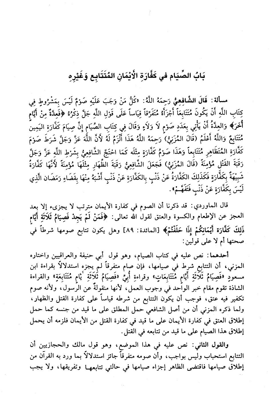 أَحَدُهُمَا: نَصَّ عَلَيْهِ فِي كِتَابِ الصِّيَامِ، وَهُوَ قَوْلُ أَبِي حَنِيفَةَ وَالْعِرَاقِيِّينَ وَاخْتَارَهُ الْمُزَنِيُّ، أَنَّ التَّتَابُعَ شَرْطٌ فِي صِيَامِهَا، فَإِنْ صَامَ مُتَفَرِّقًا لَمِ يُجْزِهِ اسْتِدْلَالًا بِقِرَاءَةِ ابْنِ مسعودٍ " فَصِيَامُ ثَلَاثَةِ أيامٍ متتابعاتٍ " وَقِرَاءَةِ أُبِيٍّ " فَصِيَامُ ثَلَاثَة أيامٍ متتابعةٍ " وَالْقِرَاءَةُ الشَّاذَّةُ تَقُومُ مَقَامَ خَبَرِ الْوَاحِدِ فِي وُجُوبِ الْعَمَلِ، لِأَنَّهَا منقولةٌ عَنِ الرَّسُولِ، وَلِأَنَّهُ صَوْمُ تَكْفِيرٍ فِيهِ عِتْقٌ، فَوَجَبَ أَنْ يَكُونَ التَّتَابُعُ مِنْ شَرْطِهِ قِيَاسًا عَلَى كَفَّارَةِ الْقَتْلِ وَالظِّهَارِ، وَلِمَا ذَكَرَهُ الْمُزَنِيُّ أَنَّ مِنْ أَصْلِ الشَّافِعِيِّ حَمْلَ الْمُطْلَقِ عَلَى مَا قُيِّدَ مِنْ جِنْسِهِ كَمَا حُمِلَ إِطْلَاقُ الْعِتْقِ فِي كَفَّارَةِ الْأَيْمَانِ عَلَى مَا قُيِّدَ فِي كَفَّارَةِ الْقَتْلِ مِنَ الْأَيْمَانِ فَلَزِمَهُ أَنْ يَحْمِلَ إِطْلَاقَ هَذَا الصِّيَامِ عَلَى مَا قُيِّدَ مِنْ تَتَابُعِهِ فِي الْقَتْلِ.