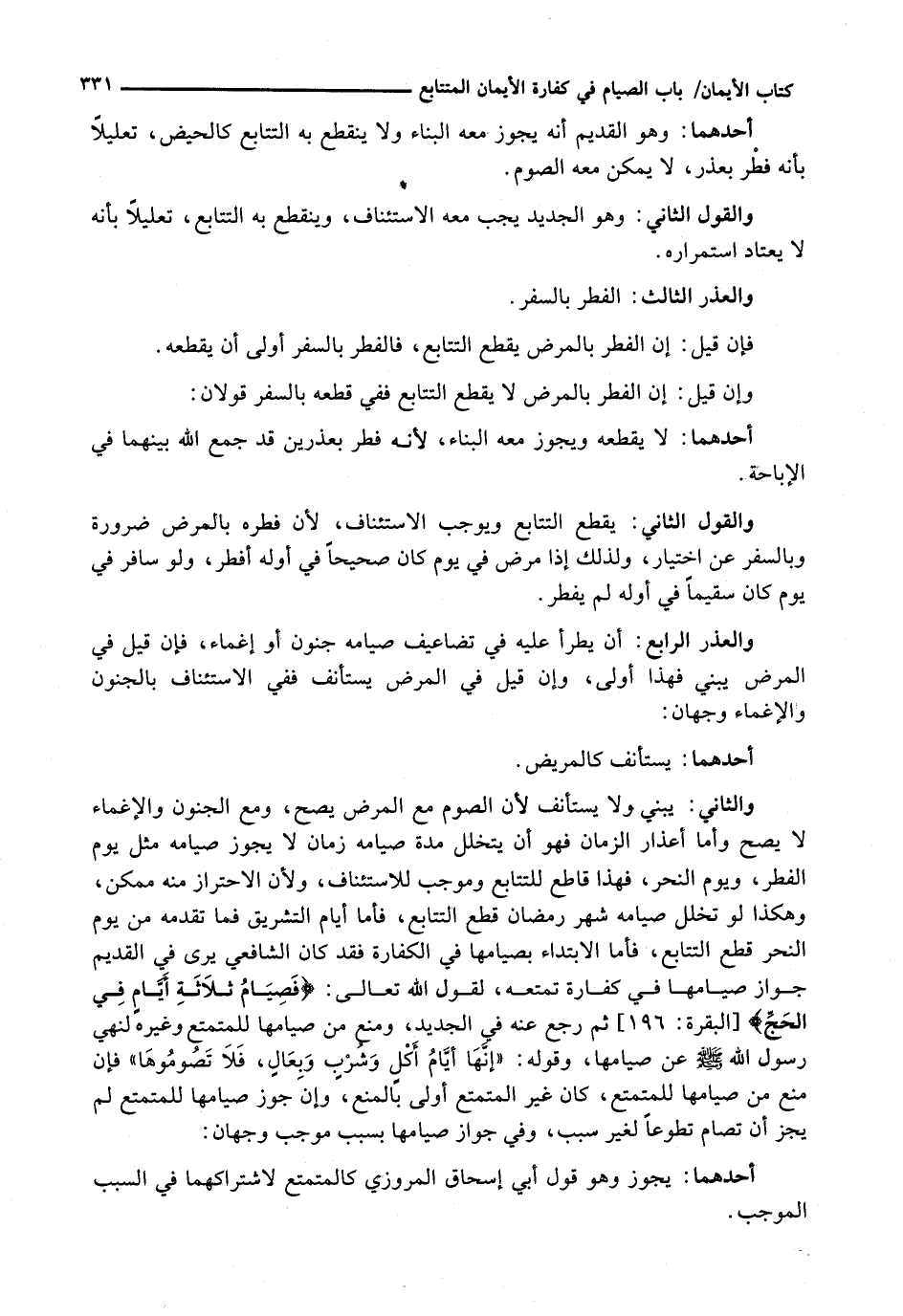 وَالثَّانِي: يَبْنِي وَلَا يَسْتَأْنِفُ لِأَنَّ الصَّوْمَ مَعَ الْمَرَضِ يَصِحُّ، وَمَعَ الْجُنُونِ وَالْإِغْمَاءِ لَا يَصِحُّ وَأَمَّا أَعْذَارُ الزَّمَانِ فَهُوَ أَنْ يَتَخَلَّلَ مُدَّةَ صِيَامِهِ زَمَانٌ لَا يَجُوزُ صِيَامُهُ مِثْلَ يَوْمِ الْفِطْرِ، وَيَوْمِ النَّحْرِ، فَهَذَا قَاطِعٌ لِلتَّتَابُعِ وَمُوجِبٌ لِلِاسْتِئْنَافِ، وَلِأَنَّ الِاحْتِرَازَ مِنْهُ مُمْكِنٌ، وَهَكَذَا لَوْ تَخَلَّلَ صِيَامَهُ شَهْرُ رَمَضَانَ قُطِعَ التَّتَابُعُ، فَأَمَّا أَيَّامُ التَّشْرِيقِ فَمَا تَقَدَّمَهُ مِنْ يَوْمِ النَّحْرِ قُطِعَ التَّتَابُعُ، فَأَمَّا الِابْتِدَاءُ بِصِيَامِهَا فِي الْكَفَّارَةِ فَقَدْ كَانَ الشَّافِعِيُّ يَرَى فِي الْقَدِيمِ جَوَازَ صِيَامِهَا فِي كَفَّارَةِ تَمَتُّعِهِ، لِقَوْلِ اللَّهُ تَعَالَى: {فَصِيَامُ ثَلاَثَةِ أيَّامٍ فِي الحَجِّ) {البقرة: 196) ثُمَّ رَجَعَ عَنْهُ فِي الْجَدِيدِ، وَمَنَعَ مِنْ صِيَامِهَا لِلْمُتَمَتِّعِ وَغَيْرِهِ لِنَهْيِ رَسُولِ اللَّهِ - صَلَّى اللَّهُ عَلَيْهِ وَسَلَّم َ - عَنْ صِيَامِهَا، وَقَوْلِهِ: " إِنَّهَا أَيَّامُ أكلٍ وشربٍ وبعالٍ، فَلَا تَصُومُوهَا " فَإِنْ مَنَعَ مِنْ صِيَامِهَا لِلْمُتَمَتِّعِ، كَانَ غَيْرُ الْمُتَمَتِّعِ أَوْلَى بِالْمَنْعِ، وَإِنْ جَوَّزَ صِيَامَهَا لِلْمُتَمَتِّعِ لَمْ يَجُزْ أَنْ تُصَامَ تَطَوُّعًا لِغَيْرِ سَبَبٍ، وَفِي جَوَازِ صِيَامِهَا بِسَبَبٍ مُوجِبٍ وَجْهَانِ: