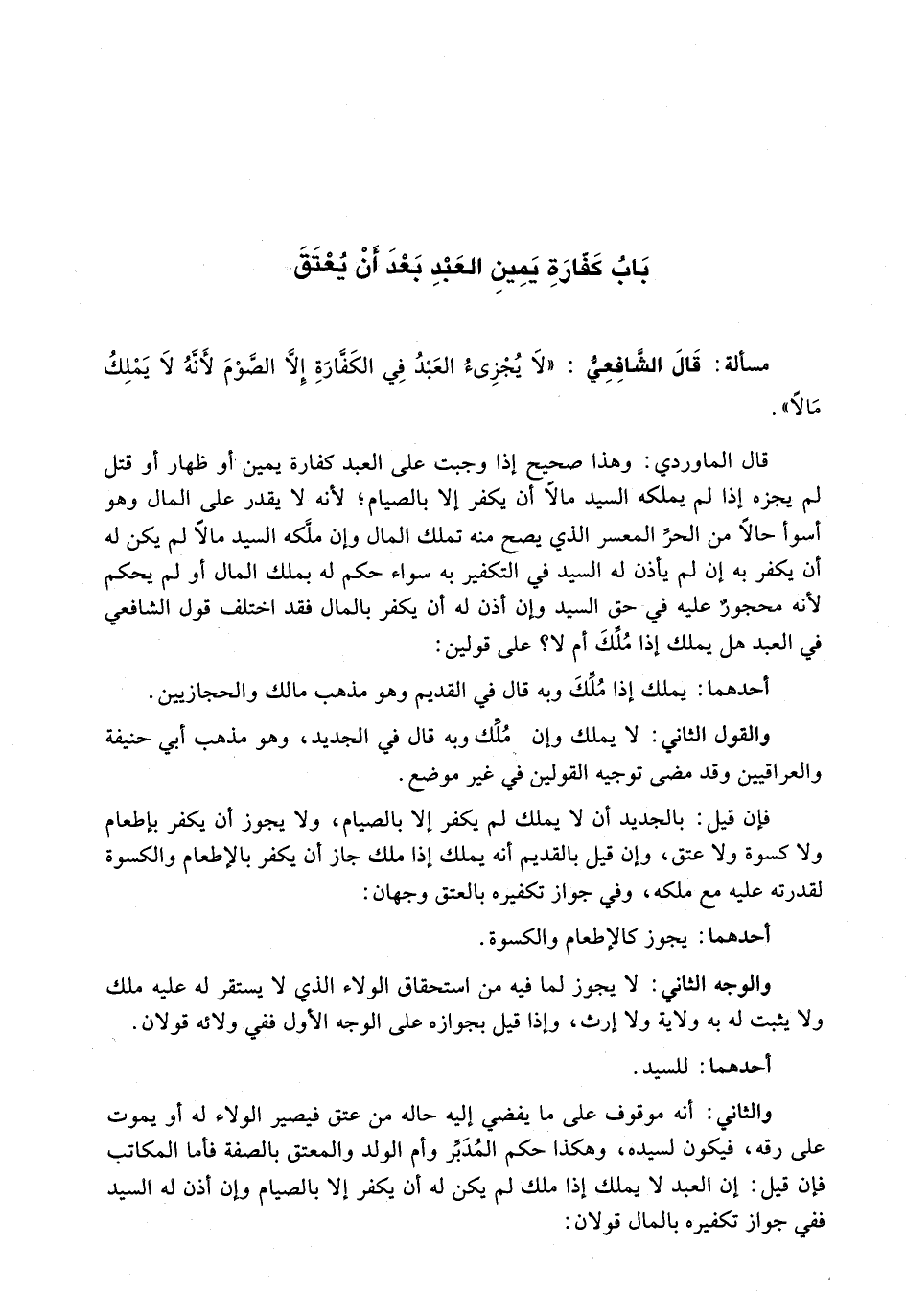 قَالَ الْمَاوَرْدِيُّ: وَهَذَا صَحِيحٌ إِذَا وَجَبَتْ عَلَى الْعَبْدِ كَفَّارَةُ يَمِينٍ أَوْ ظِهَارٍ أَوْ قَتْلٍ لَمْ يُجْزِهِ إِذَا لم يملكه السَّيِّدُ مَالًا أَنْ يُكَفِّرَ إِلَّا بِالصِّيَامِ، لِأَنَّهُ لَا يَقْدِرُ عَلَى الْمَالِ وَهُوَ أَسْوَأُ حَالًا مِنَ الْحُرِّ الْمُعْسِرِ الَّذِي يَصِحُّ مِنْهُ تَمَلُّكُ الْمَالِ وَإِنْ مَلَّكَهُ السَّيِّدُ مَالًا لَمْ يَكُنْ لَهُ أَنْ يُكَفِّرَ بِهِ إِنْ لَمْ يَأْذَنْ لَهُ السَّيِّدُ فِي التَّكْفِيرِ بِهِ سَوَاءٌ حُكِمَ لَهُ بِمِلْكِ الْمَالِ أَوْ لَمْ يُحْكَمْ لِأَنَّهُ محجورٌ عَلَيْهِ فِي حَقِّ السَّيِّدِ وَإِنْ أَذِنَ لَهُ أَنْ يُكَفِّرَ بِالْمَالِ فَقَدِ اخْتَلَفَ قَوْلُ الشَّافِعِيِّ فِي الْعَبْدِ هَلْ يَمْلِكُ إِذَا مَلَكَ أَمْ لَا؟ عَلَى قَوْلَيْنِ: