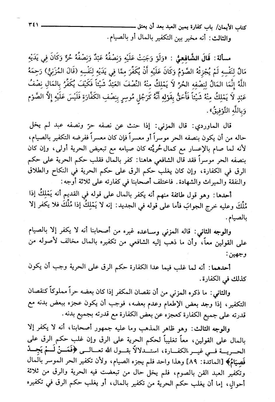 وَالثَّالِثُ: إنَّهُ مُخَيَّرٌ بَيْنَ التَّكْفِيرِ بِالْمَالِ أَوْ بالصيام. مسألة قال الشافعي: " وَلَوْ وَجَبَتْ عَلَيْهِ وَنِصْفُهُ عبدٌ وَنِصْفُهُ حرٌّ وَكَانَ فِي يَدَيْهِ مالٌ لِنَفْسِهِ لَمْ يُجْزِئْهُ الصَّوْمُ وَكَانَ عَلَيْهِ أَنْ يُكَفِّرَ مِمَّا فِي يديه لنفسه (قال المزني) رحمه الله إنما المال لنصفه الحر لا يملك منه النصف العبد شيئاً فكيف يكفر بالمال نصف عبدٍ لا يملك منه شيئاً فأحق بقوله أنه كرجلٍ موسرٍ بنصف الكفارة فليس عليه إلا الصوم وبالله التوفيق ".