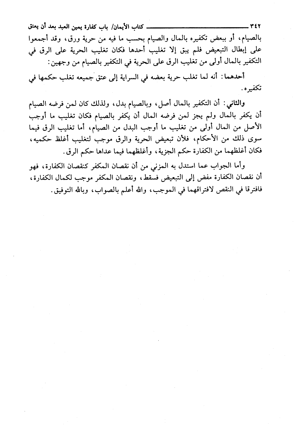 بِالصِّيَامِ، أَوْ بِبَعْضِ تَكْفِيرِهِ بِالْمَالِ وَالصِّيَامِ بِحَسْبِ مَا فِيهِ مِنْ حُرِّيَّةٍ وَرِقٍّ، وَقَدْ أَجْمَعُوا عَلَى إِبْطَالِ التَّبْعِيضِ فَلَمْ يَبْقَ إِلَّا تَغْلِيبُ أَحَدِهَا فَكَانَ تَغْلِيبُ الْحَرِيَّةِ عَلَى الرِّقِّ فِي التَّكْفِيرِ بِالْمَالِ أَوْلَى مِنْ تَغْلِيبِ الرِّقِّ عَلَى الْحُرِّيَّةِ فِي التَّكْفِيرِ بِالصِّيَامِ مِنْ وَجْهَيْنِ: