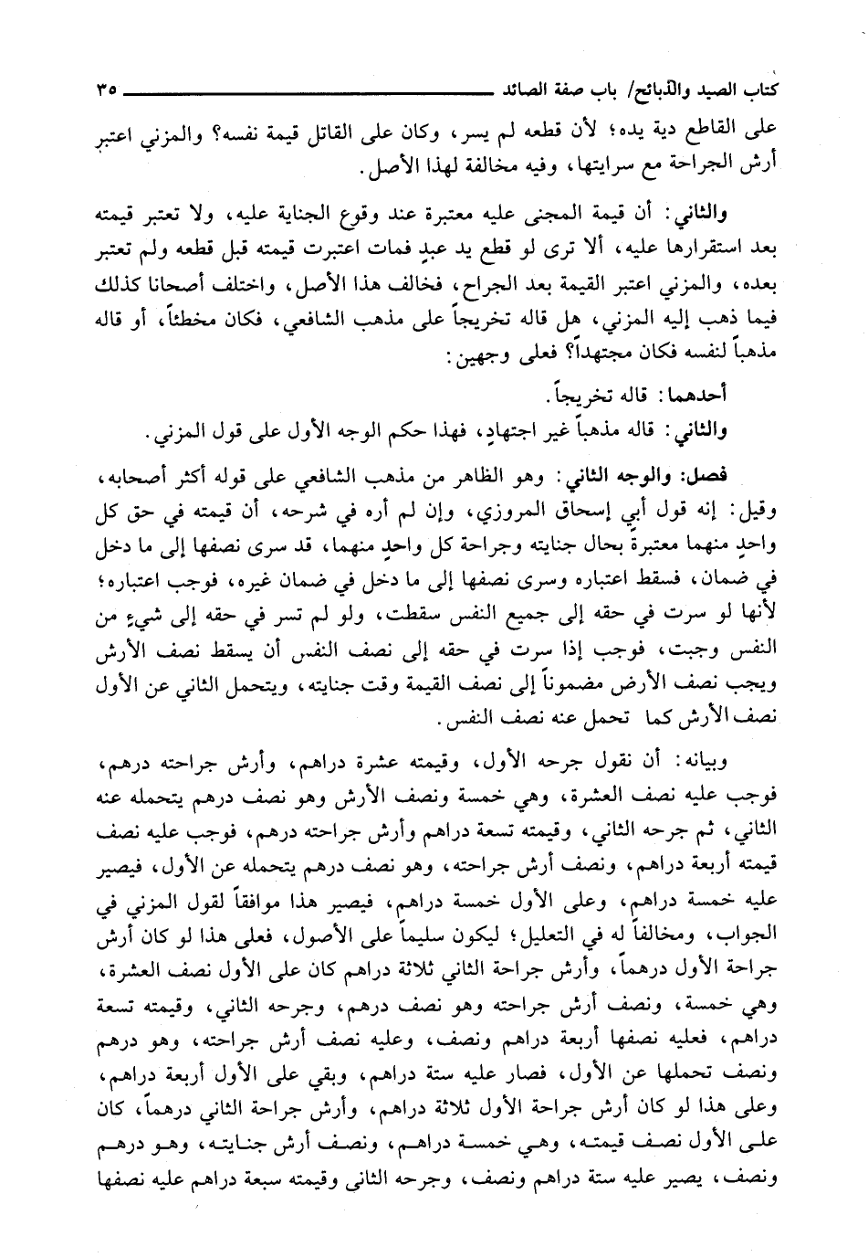 وَبَيَانُهُ: أَنْ نَقُولَ جَرَحَهُ الْأَوَّلُ، وَقِيمَتُهُ عَشَرَةُ دَرَاهِمَ، وَأَرْشُ جِرَاحَتِهِ دِرْهَمٌ، فَوَجَبَ عَلَيْهِ نِصْفُ الْعَشَرَةِ، وَهِيَ خَمْسَةٌ وَنِصْفُ الْأَرْشِ وَهُوَ نِصْفُ دِرْهَمٍ يَتَحَمَّلُهُ عَنْهُ الثَّانِي، ثُمَّ جَرَحَهُ الثَّانِي، وَقِيمَتُهُ تِسْعَةُ دَرَاهِمَ وَأَرْشُ جِرَاحَتِهِ دِرْهَمٌ، فَوَجَبَ عَلَيْهِ نِصْفُ قِيمَتِهِ أَرْبَعَةُ دَرَاهِمَ، وَنِصْفُ أَرْشِ جِرَاحَتِهِ، وَهُوَ نِصْفُ دِرْهَمٍ يَتَحَمَّلُهُ عَنِ الْأَوَّلِ، فَيَصِيرُ عَلَيْهِ خَمْسَةُ دَرَاهِمَ، وَعَلَى الْأول خَمْسَةُ دَرَاهِمَ، فَيَصِيرُ هَذَا مُوَافِقًا لِقَوْلِ الْمُزَنِيِّ فِي الْجَوَابِ، وَمُخَالِفًا لَهُ فِي التَّعْلِيلِ؛ لِيَكُونَ سَلِيمًا عَلَى الْأُصُولِ، فَعَلَى هَذَا لَوْ كَانَ أَرْشُ جِرَاحَةِ الْأَوَّلِ دِرْهَمًا، وَأَرْشُ جِرَاحَةِ الثَّانِي ثَلَاثَةَ دَرَاهِمَ كَانَ عَلَى الْأَوَّلِ نِصْفُ الْعَشَرَةِ، وَهِيَ خَمْسَةٌ، وَنِصْفُ أَرْشِ جِرَاحَتِهِ وَهُوَ نِصْفُ دِرْهَمٍ، وَجُرْحُهُ الثَّانِي، وَقِيمَتُهُ تِسْعَةُ دَرَاهِمَ، فَعَلَيْهِ نِصْفُهَا أَرْبَعَةُ دَرَاهِمَ وَنِصْفٌ، وَعَلَيْهِ نِصْفُ أَرْشِ جِرَاحَتِهِ، وَهُوَ دِرْهَمٌ وَنِصْفٌ تَحَمَّلَهَا عَنِ الْأول، فَصَارَ عَلَيْهِ سِتَّةُ دَرَاهِمَ، وَبَقِيَ عَلَى الْأَوَّلِ أَرْبَعَةُ دَرَاهِمَ، وَعَلَى هَذَا لَوْ كَانَ أَرْشُ جِرَاحَةِ الْأول ثَلَاثَةَ دَرَاهِمَ، وَأَرْشُ جِرَاحَةِ الثَّانِي دِرْهَمًا، كَانَ عَلَى الْأَوَّلِ نِصْفُ قِيمَتِهِ، وَهِيَ خَمْسَةُ دَرَاهِمَ، وَنِصْفُ أَرْشِ جِنَايَتِهِ، وَهُوَ دِرْهَمٌ وَنِصْفٌ، يَصِيرُ عَلَيْهِ سِتَّةُ دَرَاهِمَ وَنِصْفٌ، وَجُرْحُهُ الثَّانِي وَقِيمَتُهُ سَبْعَةُ دَرَاهِمَ عَلَيْهِ نصفها