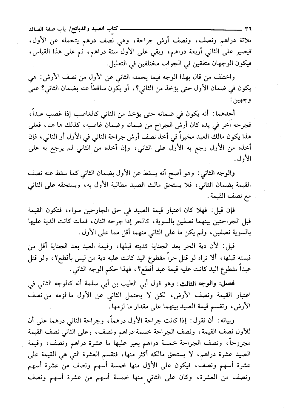 وَبَيَانُهُ: أَنْ نَقُولَ: إِذَا كَانَتْ جِرَاحَةُ الْأَوَّلِ دِرْهَمًا، وَجِرَاحَةُ الثَّانِي دِرْهَمًا عَلَى أَنَّ لِلْأَوَّلِ نِصْفَ الْقِيمَةِ، وَنِصْفُ الْجِرَاحَةِ خَمْسَةُ دَرَاهِمَ وَنِصْفٌ، وَعَلَى الثَّانِي نِصْفُ الْقِيمَةِ مَجْرُوحًا، وَنِصْفُ الْجِرَاحَةِ خمسة دراهم بعير عليها ما عَشَرَةُ دَرَاهِمَ وَنِصْفٌ، وَقِيمَةُ الصَّيْدِ عَشَرَةُ دَرَاهِمَ، لَا يَسْتَحِقُّ مَالِكُهُ أَكْثَرَ مِنْهَا، فَتُقَسَّمُ الْعَشَرَةُ الَّتِي هِيَ الْقِيمَةُ عَلَى عَشَرَةِ أَسْهُمٍ وَنِصْفٍ، فَيَكُونُ عَلَى الْأَوَّلِ مِنْهَا خَمْسَةُ أَسْهُمٍ وَنِصْفٌ من عشرة أسهم ونصف من العشرة، وكان عَلَى الثَّانِي مِنْهَا خَمْسَةُ أَسْهُمٍ مِنْ عَشَرَةِ أسهم ونصف