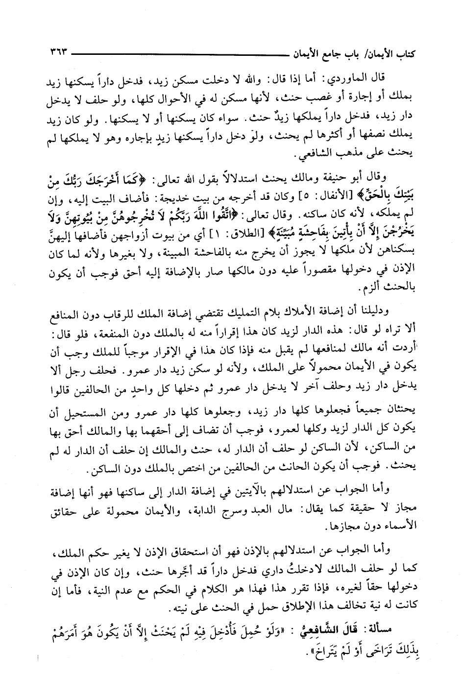 وَأَمَّا الْجَوَابُ عَنِ اسْتِدْلَالِهِمْ بِالْآيَتَيْنِ فِي إِضَافَةِ الدَّارِ إِلَى سَاكِنِهَا فَهُوَ أَنَّهَا إِضَافَةُ مَجَازٍ لَا حَقِيقَةٍ كَمَا يُقَالُ: مَالُ الْعَبْدِ وَسَرْجُ الدَّابَّةِ، وَالْأَيْمَانُ مَحْمُولَةٌ عَلَى حَقَائِقِ الْأَسْمَاءِ دُونَ مَجَازِهَا.