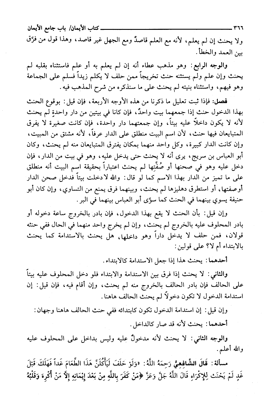 فَإِذَا ثَبَتَ تَعْلِيلُ مَا ذَكَرْنَا مِنْ هَذِهِ الْأَوْجُهِ الْأَرْبَعَةِ، فَإِنْ قِيلَ: بِوُقُوعِ الْحِنْثِ بِهَذَا الدُّخُولِ حَنِثَ إِذَا جَمَعَهُمَا بَيْتٌ واحدٌ، فَإِنْ كَانَا فِي بَيْتَيْنِ مِنْ دَارٍ واحدةٍ لَمْ يَحْنَثْ لِأَنَّهُ لَا يَكُونُ دَاخِلًا عَلَيْهِ بَيْتًا، وَإِنْ جَمَعَتْهُمَا دَارٌ وَاحِدَةٌ، فَإِنْ كَانَتْ صَغِيرَةً لَا يُفَرِّقُ الْمُتَبَايِعَانِ فِيهَا حَنِثَ، لِأَنَّ اسْمَ الْبَيْتِ مُنْطَلِقٌ عَلَى الدَّارِ عُرْفًا، لِأَنَّهُ مُشْتَقٌّ مِنَ الْمَبِيتِ، وَإِنْ كَانَتِ الدَّارُ كَبِيرَةً، وَكُلُّ وَاحِدٍ مِنْهُمَا بِمَكَانٍ يَفْتَرِقُ الْمُتَبَايِعَانِ مِنْهُ لَمْ يَحْنَثْ، وَكَانَ أَبُو الْعَبَّاسِ بْنُ سُرَيْجٍ، يَرَى أَنَّهُ لَا يَحْنَثُ حَتَّى يَدْخُلَ عَلَيْهِ، وَهُوَ فِي بَيْتٍ مِنَ الدَّارِ، فَإِنْ دَخَلَ عَلَيْهِ وَهُوَ فِي صَحْنِهَا أَوْ صُفَّتِهَا لَمْ يَحْنَثِ اعْتِبَارًا بِحَقِيقَةِ اسْمِ الْبَيْتِ أَنَّهُ مُنْطَلِقٌ عَلَى مَا تَمَيَّزَ مِنَ الدَّارِ بِهَذَا الِاسْمِ كَمَا لَوْ قَالَ: وَاللَّهِ لَا دَخَلْتُ بَيْتًا فَدَخَلَ صَحْنَ الدَّارِ أَوْ صُفَّتَهَا، أَوِ اسْتَطْرَقَ دِهْلِيزَهَا لَمْ يَحْنَثْ، وَبَيْنَهُمَا فَرْقٌ يَمْنَعُ مِنَ التَّسَاوِي، وَإِنْ كَانَ أَبُو حَنِيفَةَ يُسَوِّي بَيْنَهُمَا فِي الْحِنْثِ كَمَا سَوَّى أَبُو الْعَبَّاسِ بَيْنَهُمَا فِي الْبِرِّ.