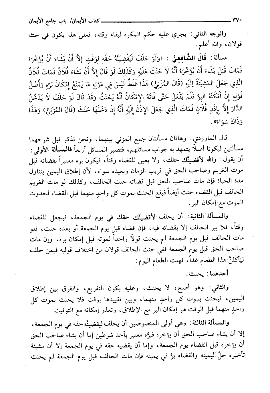 قَالَ الْمَاوَرْدِيُّ: وَهَاتَانِ مَسْأَلَتَانِ جَمَعَ الْمُزَنِيُّ بَيْنَهُمَا، وَنَحْنُ نَذْكُرُ قَبْلَ شَرْحِهِمَا مَسْأَلَتَيْنِ لِيَكُونَا أَصْلًا يَتَمَهَّدُ بِهِ جَوَابُ مَسَائِلِهِمْ، فَتَصِيرُ الْمَسَائِلُ أَرْبَعًا: فَالْمَسْأَلَةُ الْأُولَى: أَنْ يَقُولَ: وَاللَّهِ لَأَقْضِيَنَّكَ حَقَّكَ، وَلَا يُعَيِّنُ لِلْقَضَاءِ وَقْتًا، فَيَكُونُ بِرُّهُ مُعْتَبَرًا بِقَضَائِهِ قَبْلَ مَوْتِ الْغَرِيمِ وَصَاحِبِ الْحَقِّ فِي قَرِيبِ الزَّمَانِ وَبِعِيدِهِ سَوَاءٌ، لِأَنَّ إِطْلَاقَ الْيَمِينِ يَتَنَاوَلُ مُدَّةَ الْحَيَاةِ فَإِنْ مَاتَ صَاحِبُ الْحَقِّ قَبْلَ قَضَائِهِ حَنِثَ الْحَالِفُ، وَكَذَلِكَ لَوْ مَاتَ الْغَرِيمُ الْحَالِفُ قَبْلَ الْقَضَاءِ حَنِثَ أَيْضًا فَيَقَعُ الْحِنْثُ بِمَوْتِ كُلِّ واحدٍ مِنْهُمَا قَبْلَ الْقَضَاءِ لِحُدُوثِ الْمَوْتِ مَعَ إِمْكَانِ الْبِرِّ.
