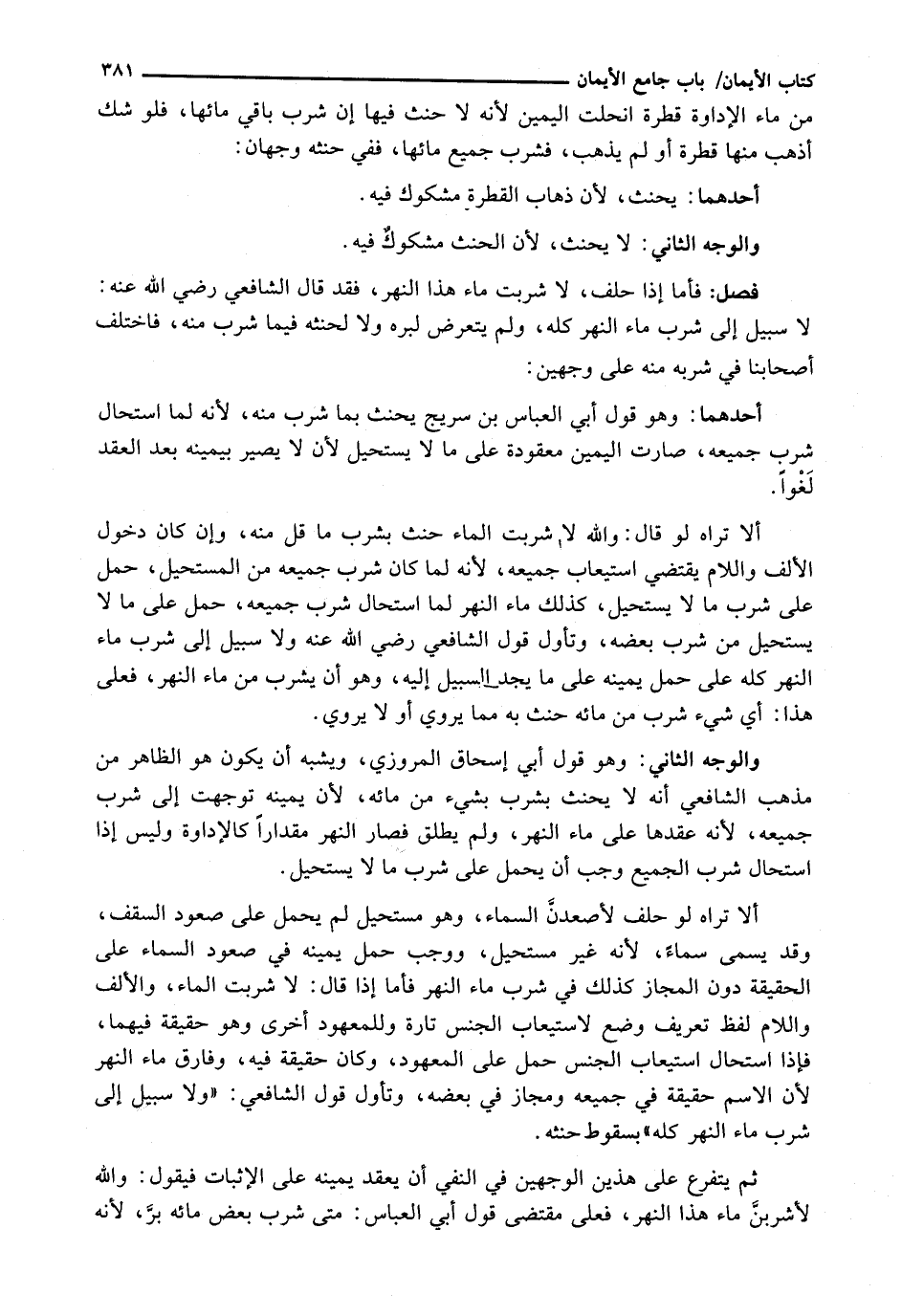 أَلَا تَرَاهُ لَوْ قَالَ: وَاللَّهِ لَا شَرِبْتُ الْمَاءَ حَنِثَ بِشُرْبِ مَا قَلَّ مِنْهُ، وَإِنْ كَانَ دُخُولُ الْأَلِفِ وَاللَّامِ يَقْتَضِي اسْتِيعَابَ جَمِيعِهِ، لِأَنَّهُ لَمَّا كَانَ شُرْبُ جَمِيعِهِ مِنَ الْمُسْتَحِيلِ، حُمِلَ عَلَى شُرْبِ مَا لَا يَسْتَحِيلُ، كَذَلِكَ مَاءُ النَّهْرِ لَمَّا اسْتَحَالَ شُرْبُ جَمِيعِهِ، حُمِلَ عَلَى مَا لَا يَسْتَحِيلُ مِنْ شُرْبِ بَعْضِهِ، وَتَأَوَّلَ قَوْلَ الشَّافِعِيِّ رَضِيَ اللَّهُ عَنْهُ وَلَا سَبِيلَ إِلَى شُرْبِ مَاءِ النَّهْرِ كُلِّهِ عَلَى حَمْلِ يَمِينِهِ عَلَى مَا يَجِدُ السَبِيل إِلَيْهِ، وَهُوَ أَنْ يَشْرَبَ مِنْ مَاءِ النَّهْرِ، فَعَلَى هَذَا: أَيُّ شَيْءٍ شَرِبَ مِنْ مَائِهِ حَنِثَ بِهِ مِمَّا يَرْوِي أَوْ لَا يَرْوِي.