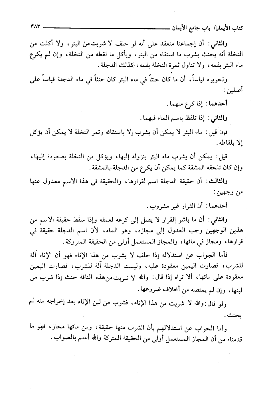 وَالثَّانِي: إنَّ إِجْمَاعَنَا مُنْعَقِدٌ عَلَى أَنَّهُ لَوْ حَلَفَ لَا شَرِبْتُ مِنَ الْبِئْرِ، وَلَا أَكَلْتُ مِنَ النَّخْلَةِ أَنَّهُ يَحْنَثُ بِشُرْبِ مَا اسْتَقَاهُ من البئر، ويأكل مَا لَقَطَهُ مِنَ النَّخْلَةِ، وَإِنْ لَمْ يَكْرَعْ مَاءَ الْبِئْرِ بِفَمِهِ، وَلَا تَنَاوَلَ ثَمَرَةَ النَّخْلَةِ بِفَمِهِ، كَذَلِكَ الدِّجْلَةُ.