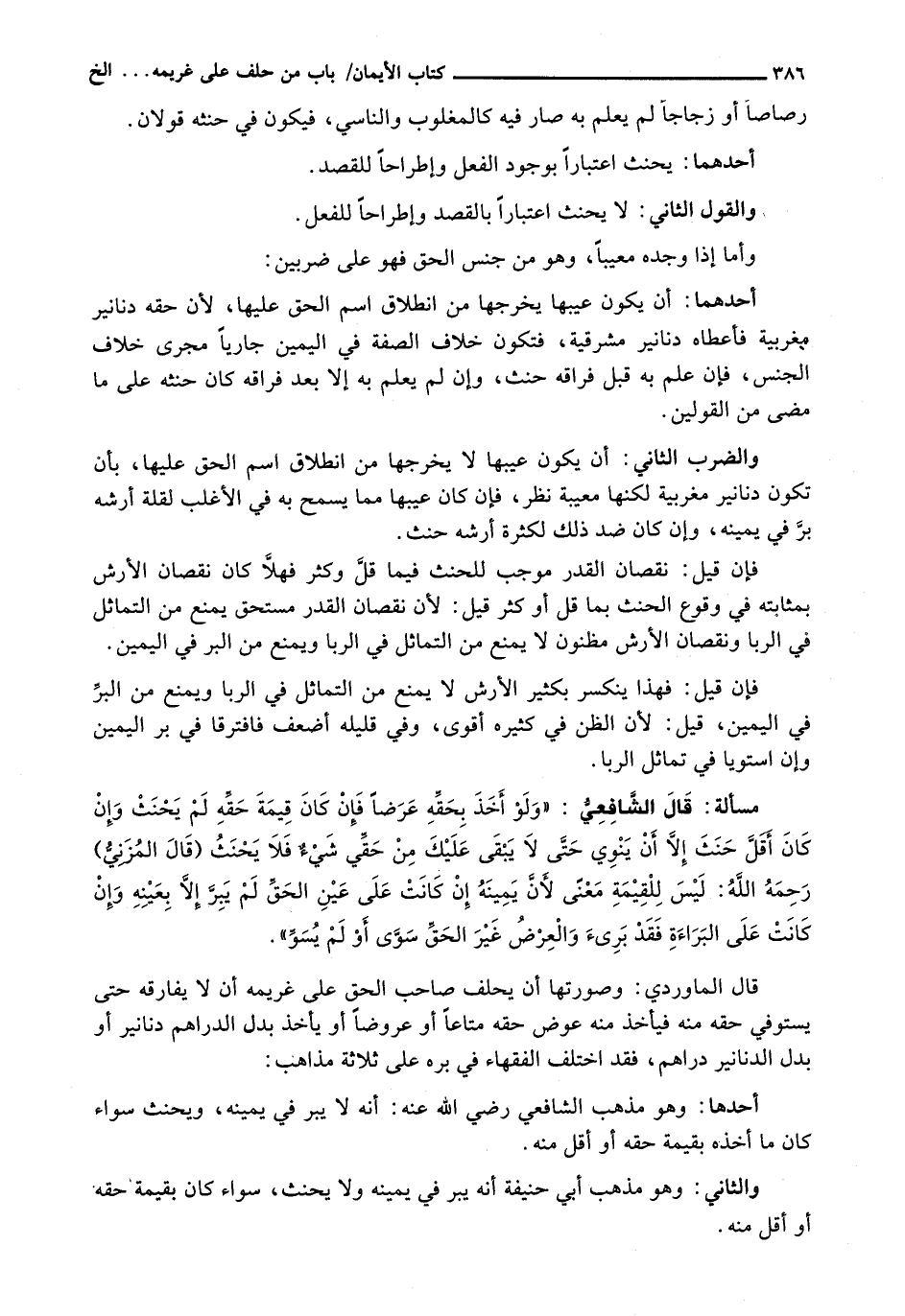 قال الشافعي: " وَلَوْ أَخَذَ بِحَقِّهِ عَرَضًا فَإِنْ كَانَ قِيمَةَ حَقِّهِ لَمْ يَحْنَثْ وَإِنْ كَانَ أَقَلَّ حَنِثَ إِلَّا أَنْ يَنْوِيَ حَتَّى لَا يَبْقَى عَلَيْكَ مِنْ حَقِّي شيءٌ فَلَا يَحْنَثُ (قَالَ الْمُزَنِيُّ) رحمه الله: لَيْسَ لِلْقِيمَةِ مَعْنًى لِأَنَّ يَمِينَهُ إِنْ كَانَتْ على عين الْحَقِّ لَمْ يَبَرَّ إِلَّا بِعَيْنِهِ وَإِنْ كَانَتْ على البراءة فقد برئ والعرض غير الحق سوى أو لم يسو ".