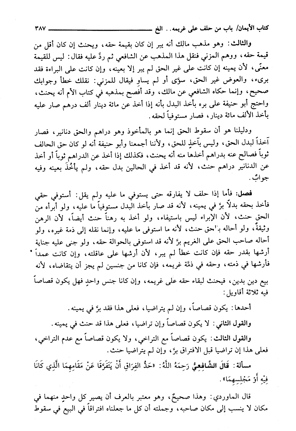 وَالثَّالِثُ: وَهُوَ مَذْهَبُ مَالِكٍ إنَّهُ يَبَرُّ إِنْ كَانَ بِقِيمَةِ حَقِّهِ، وَيَحْنَثُ إِنْ كَانَ أَقَلَّ مِنْ قِيمَةِ حَقِّهِ، وَوَهِمَ الْمُزَنِيُّ فَنَقَلَ هَذَا الْمَذْهَبَ عَنِ الشَّافِعِيِّ ثُمَّ رَدَّ عَلَيْهِ فَقَالَ: لَيْسَ لِلْقِيمَةِ مَعْنًى، لِأَنَّ يَمِينَهُ إِنْ كَانَتْ عَلَى غَيْرِ الْحَقِّ لَمْ يَبَرَّ إِلَّا بِعَيْنِهِ، وَإِنْ كَانَتْ عَلَى الْبَرَاءَةِ فَقَدْ بَرِئَ، وَالْعِوَضُ غير الحق، سوى أو لم يساو فَيُقَالُ لِلْمُزَنِيِّ: نَقْلُكَ خَطَأٌ وَجَوَابُكَ صَحِيحٌ، وَإِنَّمَا حَكَاهُ الشَّافِعِيُّ عَنْ مَالِكٍ، وَقَدْ أَفْصَحَ بِمَذْهَبِهِ فِي كِتَابِ الْأُمِّ إنَّهُ يَحْنَثُ، وَاحْتَجَّ أَبُو حَنِيفَةَ عَلَى بِرِّهِ بِأَخْذِ الْبَدَلِ بِأَنَّهُ إِذَا أَخَذَ عَنْ مِائَةِ دِينَارٍ أَلْفَ دِرْهَمٍ صَارَ عَلَيْهِ بِأَخْذِ الْأَلْفِ مِائَةُ دِينَارٍ، فَصَارَ مُسْتَوْفِيًا لِحَقِّهِ.