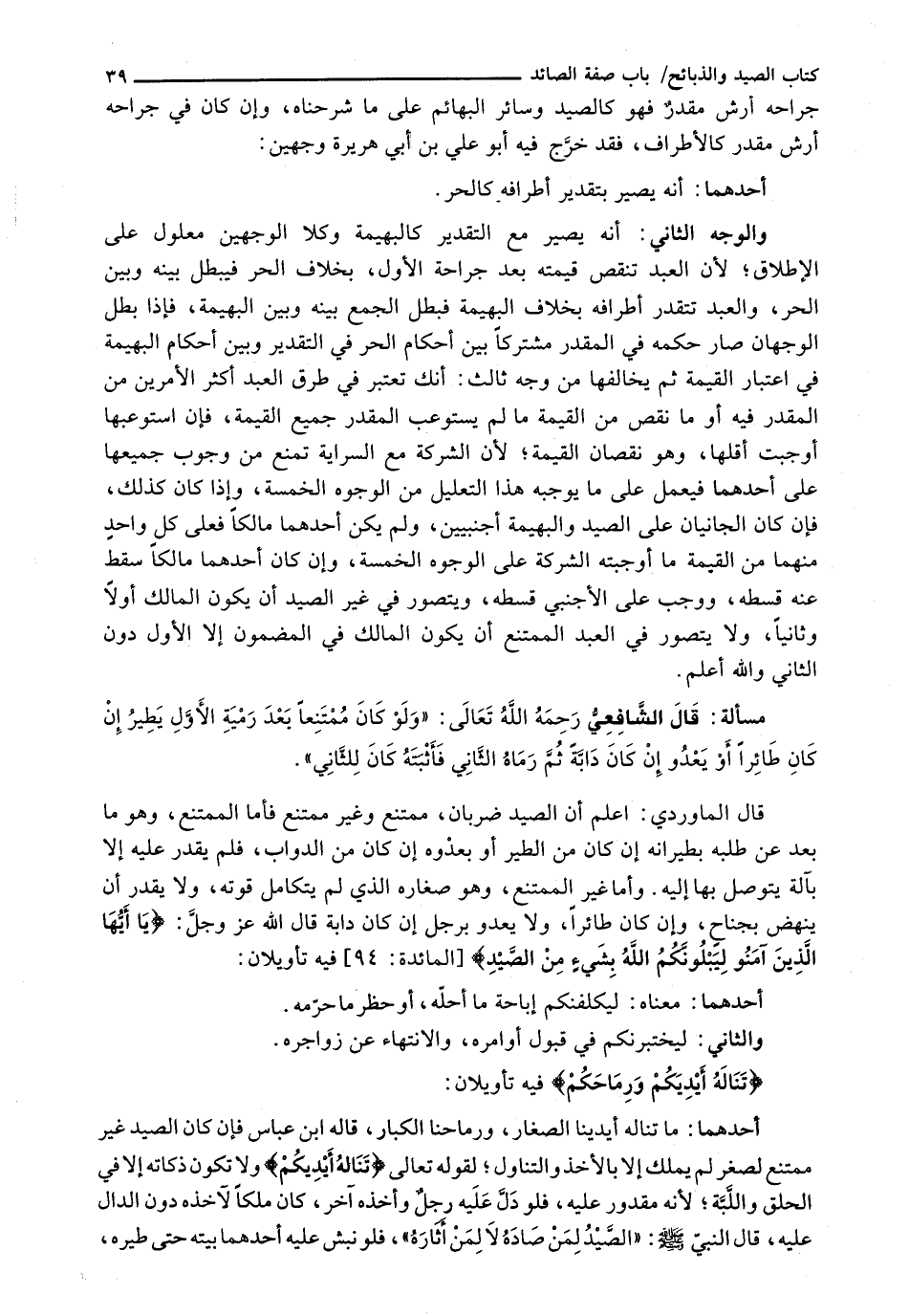 وَالْوَجْهُ الثَّانِي: إِنَّهُ يَصِيرُ مَعَ التَّقْدِيرِ كَالْبَهِيمَةِ وَكِلَا الْوَجْهَيْنِ مَعْلُولٌ عَلَى الْإِطْلَاقِ؛ لِأَنَّ الْعَبْدَ تَنْقُصُ قِيمَتُهُ بَعْدَ جِرَاحَةِ الْأَوَّلِ، بِخِلَافِ الْحُرِّ فَيَبْطُلُ بَيْنَهُ وَبَيْنَ الْحُرِّ، وَالْعَبْدُ تَتَقَدَّرُ أَطْرَافُهُ بِخِلَافِ الْبَهِيمَةِ فَبَطَلَ الْجَمْعُ بَيْنَهُ وَبَيْنَ الْبَهِيمَةِ، فَإِذَا بَطَلَ الْوَجْهَانِ صَارَ حُكْمُهُ فِي الْمُقَدَّرِ مُشْتَرِكًا بَيْنَ أَحْكَامِ الْحُرِّ فِي التَّقْدِيرِ وَبَيْنَ أَحْكَامِ البهيمة في اعتبار القيمة ثم يخالفها في وجه ثالث: أنك تعتبر في طرق الْعَبْدِ أَكْثَرَ الْأَمْرَيْنِ مِنَ الْمُقَدَّرِ فِيهِ أَوْ مَا نَقَصَ مِنَ الْقِيمَةِ مَا لَمْ يَسْتَوْعِبِ الْمُقَدَّرُ جَمِيعَ الْقِيمَةِ، فَإِنِ اسْتَوْعَبَهَا أَوْجَبْتَ أَقَلَّهَا، وَهُوَ نُقْصَانُ الْقَيِّمَةِ؛ لِأَنَّ الشَّرِكَةَ مَعَ السِّرَايَة تَمْنَعُ مِنْ وُجُوبِ جَمِيعِهَا عَلَى أَحَدِهِمَا فَيُعْمَلُ عَلَى مَا يُوجِبُهُ هَذَا التَّعْلِيلُ مِنَ الْوُجُوهِ الْخَمْسَةِ، وَإِذَا كَانَ كَذَلِكَ، فَإِنْ كَانَ الْجَانِيَانِ عَلَى الصَّيْدِ وَالْبَهِيمَةِ أَجْنَبِيَّيْنِ، وَلَمْ يَكُنْ أَحَدُهُمَا مَالِكًا فَعَلَى كُلِّ واحدٍ مِنْهُمَا مِنَ الْقِيمَةِ مَا أَوْجَبَتْهُ الشَّرِكَةُ عَلَى الْوُجُوهِ الْخَمْسَةِ، وَإِنْ كَانَ أَحَدُهُمَا مَالِكًا سَقَطَ عَنْهُ قِسْطُهُ، وَوَجَبَ عَلَى الْأَجْنَبِيِّ قِسْطُهُ، وَيُتَصَوَّرُ فِي غَيْرِ الصَّيْدِ أَنْ يَكُونَ الْمَالِكُ أَوَّلًا وَثَانِيًا، وَلَا يُتَصَوَّرُ فِي الْعَبْدِ الْمُمْتَنِعِ أَنْ يَكُونَ الْمَالِكُ فِي الْمَضْمُونِ إِلَّا الْأَوَّلَ دُونَ الثَّانِي وَاللَّهُ أَعْلَمُ.