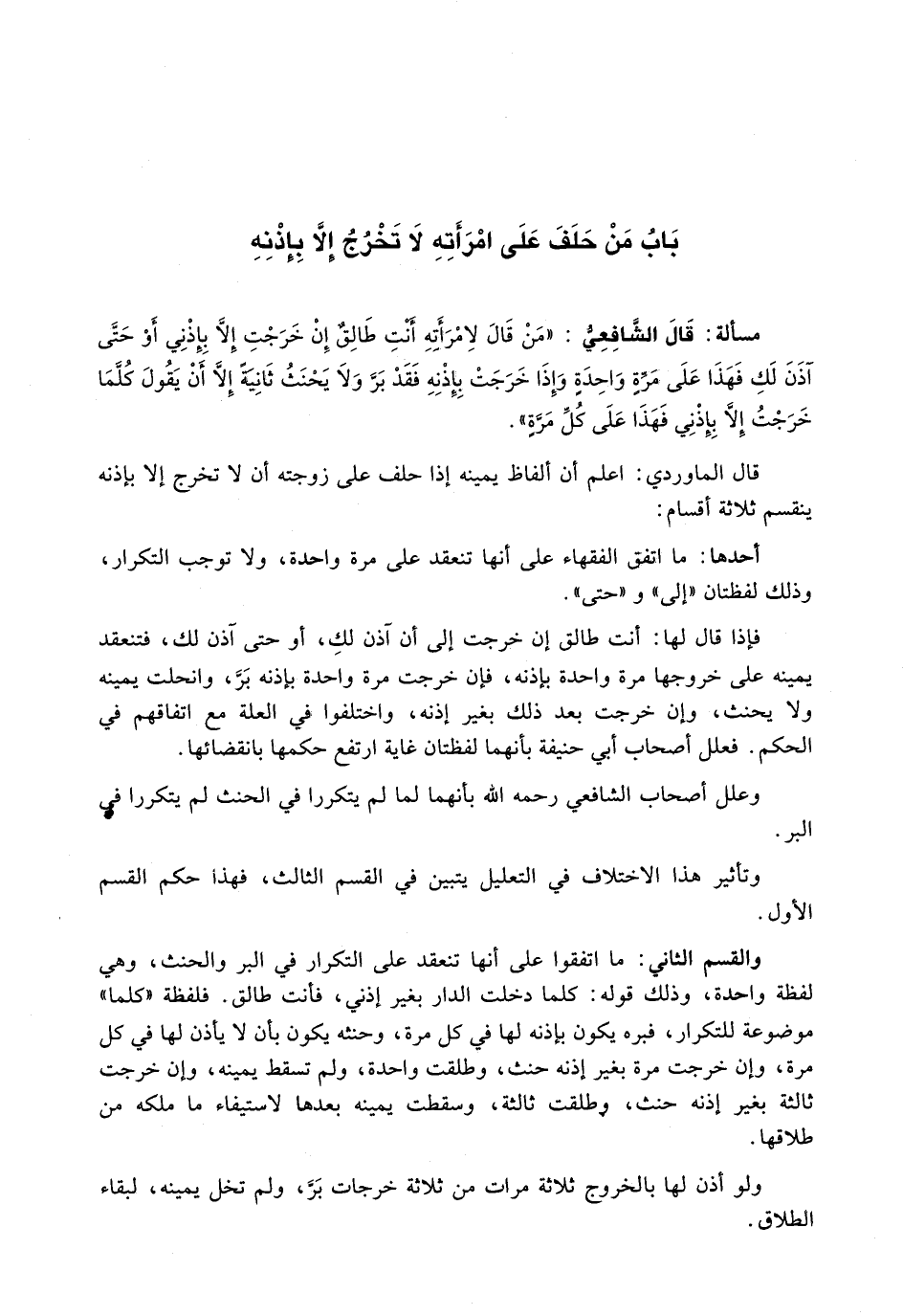 قَالَ الْمَاوَرْدِيُّ: اعْلَمْ أَنَّ أَلْفَاظَ يَمِينِهِ إِذَا حَلَفَ عَلَى زَوْجَتِهِ أَنْ لَا تَخْرُجَ إِلَّا بِإِذْنِهِ يَنْقَسِمُ ثَلَاثَةَ أَقْسَامٍ: