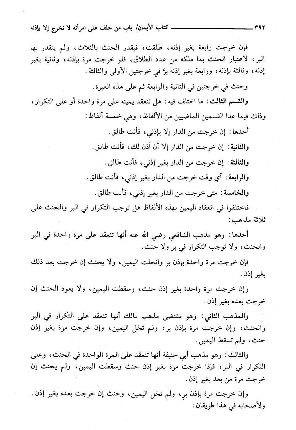 وَالثَّالِثُ: وَهُوَ مَذْهَبُ أَبِي حَنِيفَةَ أَنَّهَا تَنْعَقِدُ عَلَى الْمَرَّةِ الْوَاحِدَةِ فِي الْحِنْثِ، وَعَلَى التَّكْرَارِ فِي الْبِرِّ، فَإِذَا خَرَجَتْ مَرَّةً بِغَيْرِ إِذْنٍ حَنِثَ وَسَقَطَتِ الْيَمِينُ، وَلَمْ يَحْنَثْ إِنْ خَرَجَتْ مَرَّةً مِنْ بَعْدُ بِغَيْرِ إِذْنٍ.