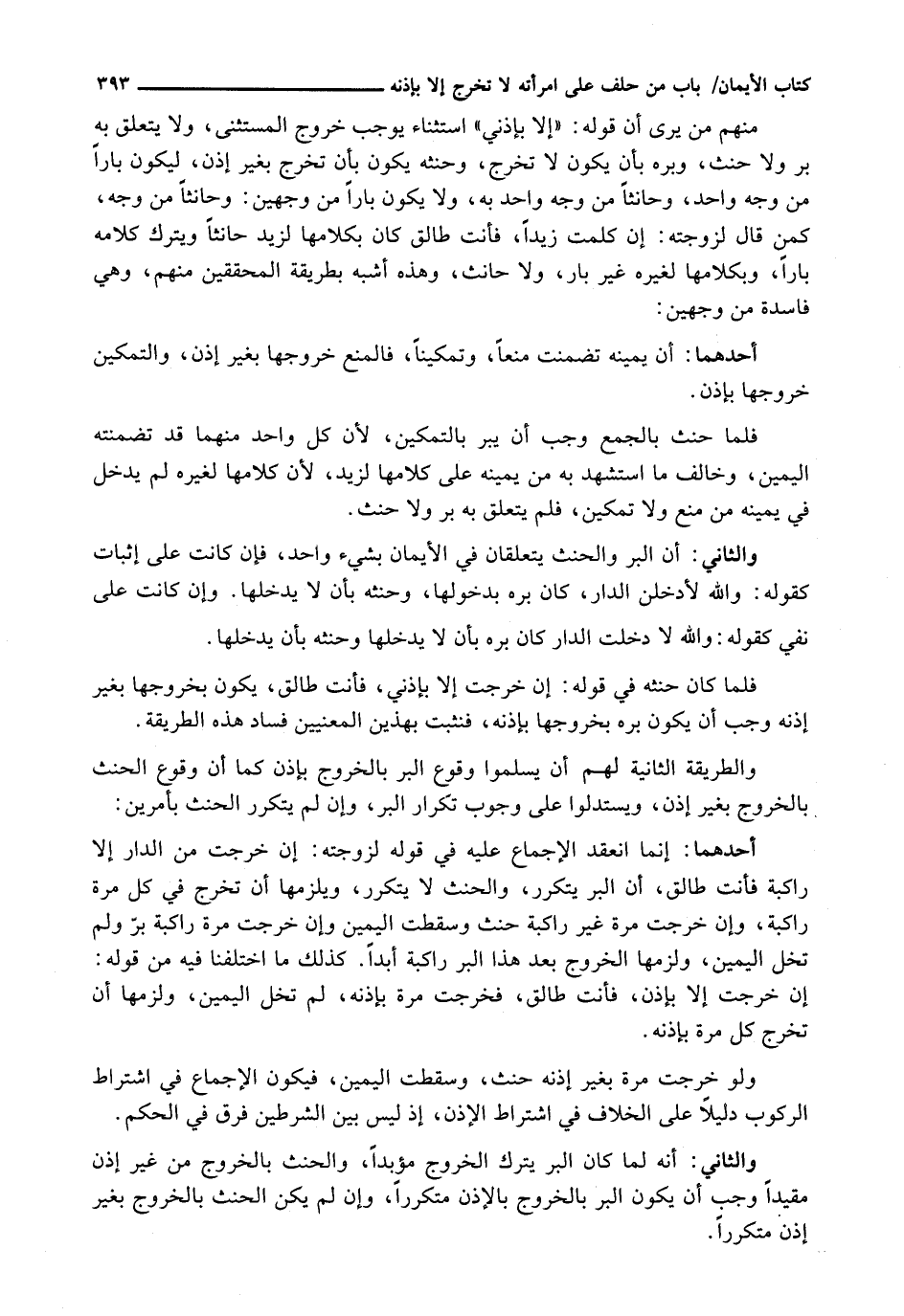 مِنْهُمْ مَنْ يَرَى أَنَّ قَوْلَهُ: " إِلَّا بِإِذْنِي " اسْتِثْنَاءٌ يُوجِبُ خُرُوجَ الْمُسْتَثْنَى، وَلَا يَتَعَلَّقُ بِهِ بِرٌّ وَلَا حِنْثٌ، وَبِرُّهُ بِأَنْ يَكُونَ لَا تَخْرُجُ، وَحِنْثُهُ يَكُونُ بِأَنْ تَخْرُجَ بِغَيْرِ إِذْنٍ، لِيَكُونَ بَارًّا مِنْ وَجْهٍ وَاحِدٍ، وَحَانِثًا مِنْ وَجْهٍ وَاحِدٍ بِهِ، وَلَا يَكُونُ بَارًّا مِنْ وَجْهَيْنِ: وَحَانِثًا مِنْ وَجْهٍ، كَمَنْ قَالَ لِزَوْجَتِهِ: إِنْ كَلَّمْتِ زَيْدًا، فَأَنْتِ طَالِقٌ كَانَ بِكَلَامِهَا لزيد حانثاً ويترك كَلَامِهِ بَارًّا، وَبِكَلَامِهَا لِغَيْرِهِ غَيْرَ بَارٍّ، وَلَا حَانِثٍ، وَهَذِهِ أَشْبَهُ بِطَرِيقَةِ الْمُحَقِّقِينَ مِنْهُمْ، وَهِيَ فَاسِدَةٌ مِنْ وَجْهَيْنِ: