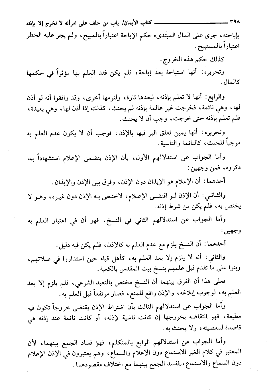 وَأَمَّا الْجَوَابُ عَنِ اسْتِدْلَالِهِمُ الثَّالِثِ بِأَنَّ اشْتِرَاطَ الْإِذْنِ يَقْتَضِي خُرُوجًا تَكُونُ فِيهِ مُطِيعَةً، فَهُوَ انْتِقَاضُهُ بِخُرُوجِهَا إِنْ كَانَتْ نَاسِيَةً لِإِذْنِهِ، أَوْ كَانَتْ نَائِمَةً عِنْدَ إِذْنِهِ هِيَ قَاصِدَةٌ لِمَعْصِيَتِهِ، وَلَا يَحْنَثُ بِهِ.