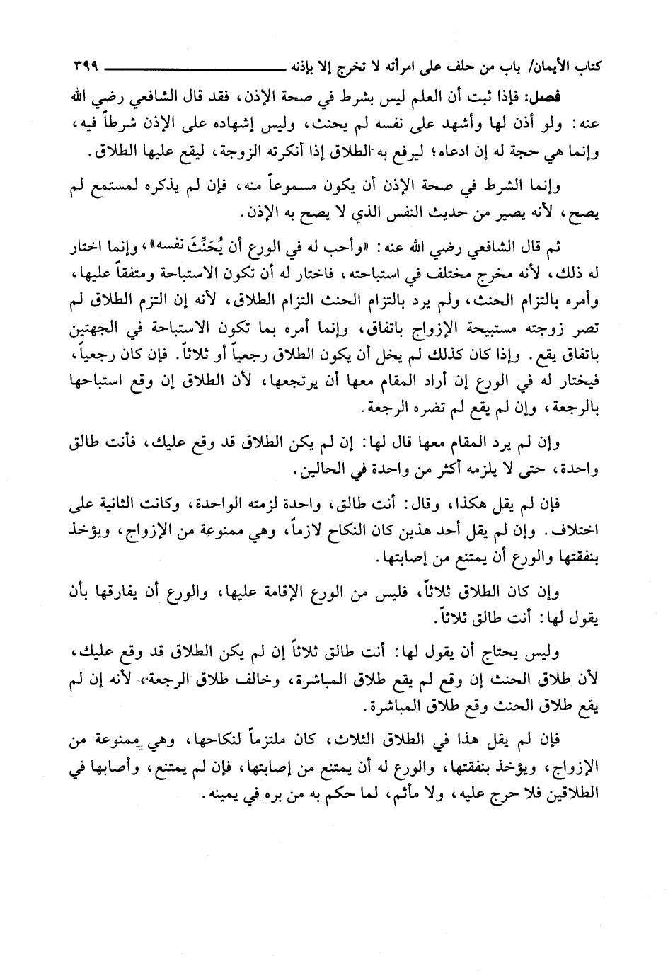 فَإِذَا ثَبَتَ أَنَّ الْعِلْمَ لَيْسَ بِشَرْطٍ فِي صِحَّةِ الْإِذْنِ، فَقَدْ قَالَ الشَّافِعِيُّ رَضِيَ اللَّهُ عَنْهُ: وَلَوْ أَذِنَ لَهَا وَأَشْهَدَ عَلَى نَفْسِهِ لَمْ يَحْنَثْ، وَلَيْسَ إِشْهَادُهُ عَلَى الْإِذْنِ شَرْطًا فِيهِ، وَإِنَّمَا هِيَ حُجَّةٌ لَهُ إِنِ ادَّعَاهُ؛ لِيَرْفَعَ بِهِ الطَّلَاقَ إِذَا أَنْكَرَتْهُ الزَّوْجَةُ، لِيَقَعَ عَلَيْهَا الطَّلَاقُ.