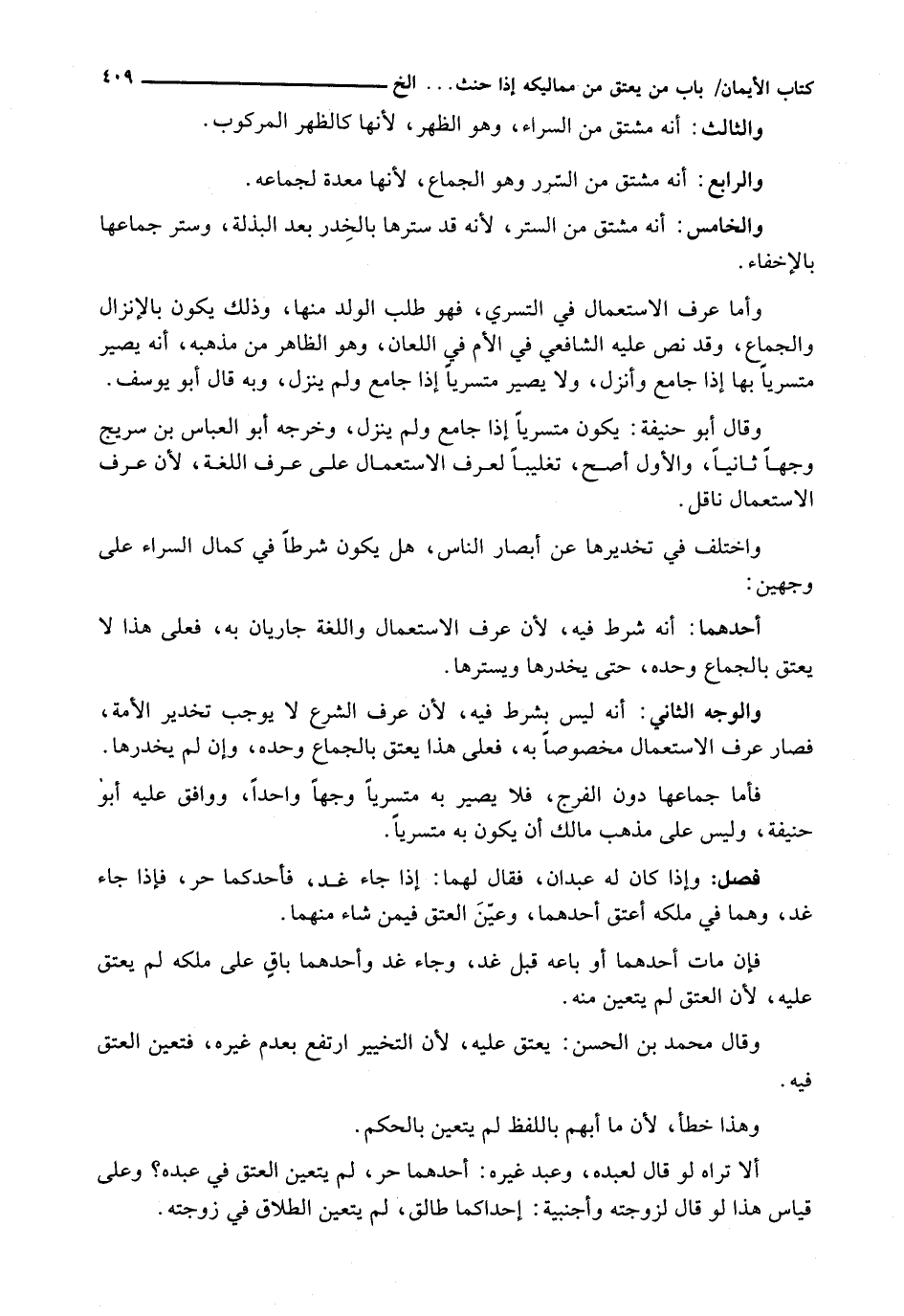 وَأَمَّا عُرْفُ الِاسْتِعْمَالِ فِي التَّسَرِّي، فَهُوَ طَلَبُ الْوَلَدِ مِنْهَا، وَذَلِكَ يَكُونُ بِالْإِنْزَالِ وَالْجِمَاعِ، وَقَدْ نَصَّ عليه الشافعي في الأمر فِي اللِّعَانِ، وَهُوَ الظَّاهِرُ مِنْ مَذْهَبِهِ، أَنَّهُ يَصِيرُ مُتَسَرِّيًا بِهَا إِذَا جَامَعَ وَأَنْزَلَ، وَلَا يَصِيرُ مُتَسَرِّيًا إِذَا جَامَعَ وَلَمْ يُنْزِلْ، وَبِهِ قَالَ أَبُو يُوسُفَ.