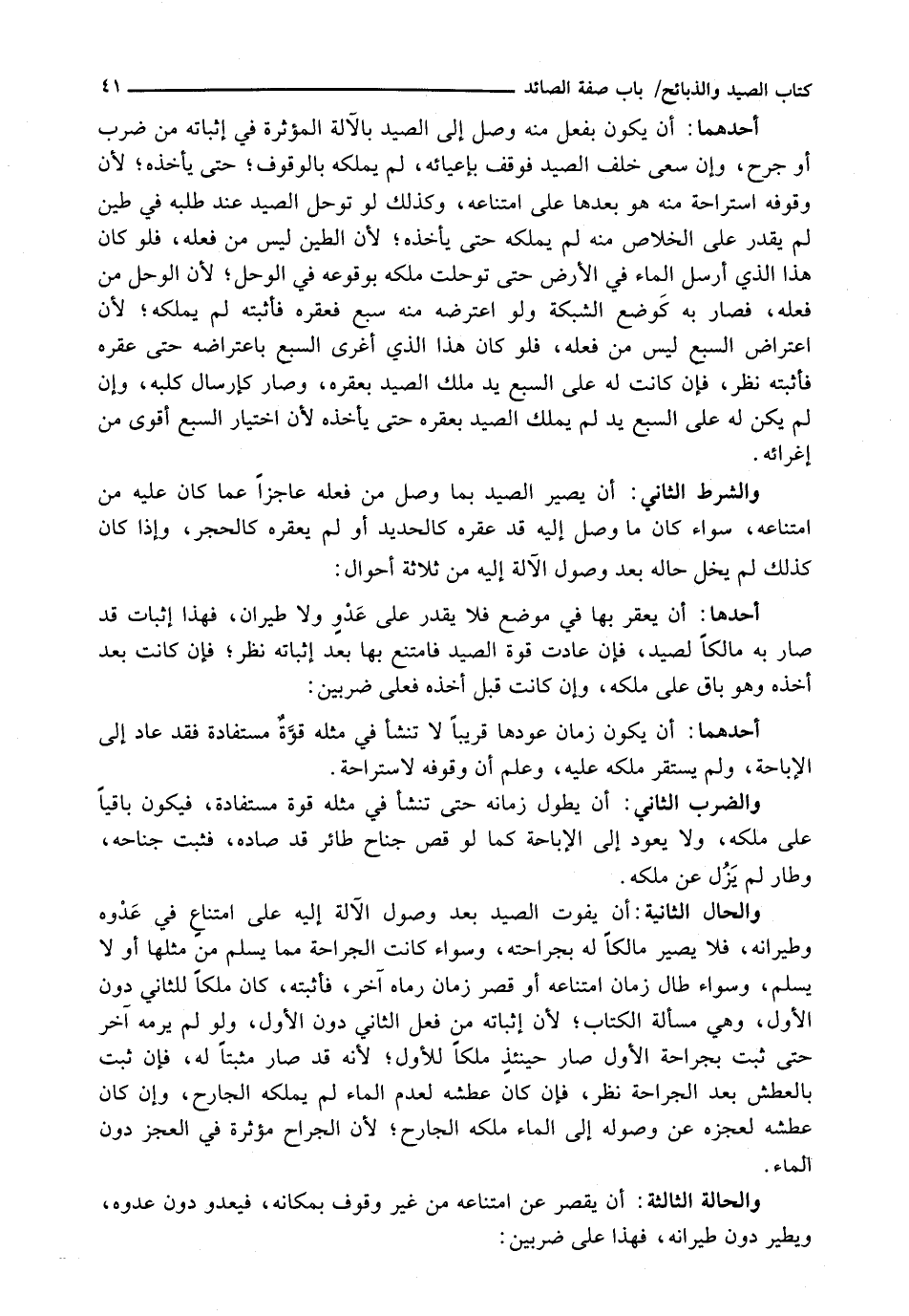 أَحَدُهُمَا: أَنْ يَكُونَ بِفِعْلٍ مِنْهُ وَصَلَ إِلَى الصَّيْدِ بِالْآلةِ الْمُؤَثِّرَةِ فِي إِثْبَاتِهِ مِنْ ضَرْبٍ أَوْ جَرْحٍ، وَإِنْ سَعَى خَلْفَ الصَّيْدِ فَوَقَفَ بِإِعْيَائِهِ، لَمْ يَمْلِكْهُ بِالْوُقُوفِ؛ حَتَّى يَأْخُذَهُ؛ لِأَنَّ وُقُوفَهُ اسْتِرَاحَةٌ مِنْهُ هُوَ بَعْدَهَا عَلَى امْتِنَاعِهِ، وَكَذَلِكَ لَوْ تَوَحَّلَ الصَّيْدُ عِنْدَ طَلَبِهِ فِي طِينٍ لَمْ يَقْدِرْ عَلَى الْخَلَاصِ مِنْهُ لَمْ يَمْلِكْهُ حَتَّى يَأْخُذَهُ؛ لِأَنَّ الطِّينَ لَيْسَ مِنْ فِعْلِهِ، فَلَوْ كَانَ هَذَا الَّذِي أَرْسَلَ الْمَاءَ فِي الْأَرْضِ حَتَّى تَوَحَّلَتْ مَلَكَهُ بِوُقُوعِهِ فِي الْوَحْلِ؛ لِأَنَّ الْوَحْلَ مِنْ فِعْلِهِ فَصَارَ بِهِ كَوَضْعِ الشَّبَكَةِ وَلَوِ اعْتَرَضَهُ مِنْهُ سَبُعٌ فَعَقَرَهُ فَأَثْبَتَهُ لَمْ يَمْلِكْهُ؛ لِأَنَّ اعْتِرَاضَ السَّبُعِ لَيْسَ مِنْ فِعْلِهِ، فَلَوْ كَانَ هَذَا الَّذِي أَغْرَى السَّبُعَ بِاعْتِرَاضِهِ حَتَّى عَقَرَهُ فَأَثْبَتَهُ نُظِرَ، فَإِنْ كَانَتْ لَهُ عَلَى السَّبُعِ يَدٌ مَلَكَ الصَّيْدَ بِعَقْرِهِ، وَصَارَ كَإِرْسَالِ كَلْبِهِ، وَإِنْ لَمْ يَكُنْ لَهُ عَلَى السَّبُعِ يَدٌ لَمْ يَمْلِكِ الصَّيْدَ بِعَقْرِهِ حَتَّى يَأْخُذَهُ لِأَنَّ اخْتِيَارَ السَّبُعِ أَقْوَى مِنْ إِغْرَائِهِ.