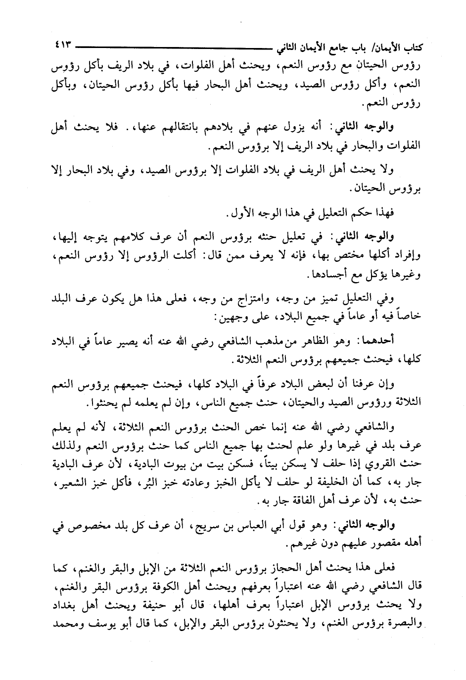 فَعَلَى هَذَا يَحْنَثُ أَهْلُ الْحِجَازِ بِرُؤُوسِ النَّعَمِ الثَّلَاثَةِ مِنَ الْإِبِلِ وَالْبَقَرِ وَالْغَنَمِ، كَمَا قَالَ الشَّافِعِيُّ رَضِيَ اللَّهُ عَنْهُ اعْتِبَارًا بِعُرْفِهِمْ وَيَحْنَثُ أَهْلُ الكوفة برؤوس البقر والغنم، ولا يحنث بِرُؤُوسِ الْإِبِلِ اعْتِبَارًا بِعُرْفِ أَهْلِهَا، قَالَ أَبُو حَنِيفَةَ وَيَحْنَثُ أَهْلُ بَغْدَادَ وَالْبَصْرَةِ بِرُؤُوسِ الْغَنَمِ، وَلَا يَحْنَثُونَ بِرُؤُوسِ الْبَقَرِ وَالْإِبِلِ، كَمَا قَالَ أَبُو يُوسُفَ وَمُحَمَّدٌ