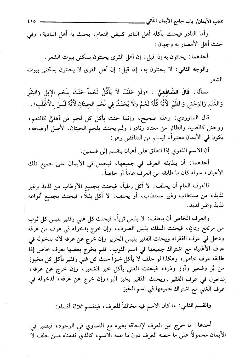 قال الشافعي: " وَلَوْ حَلَفَ لَا يَأْكُلُ لَحْمًا حَنَثَ بِلَحْمِ الْإِبِلِ وَالْبَقَرِ وَالْغَنَمِ وَالْوَحْشِ وَالطَّيْرِ لِأَنَّهُ كُلُّهُ لحمٌ وَلَا يَحْنَثُ فِي لَحْمِ الْحِيتَانِ لِأَنَّهُ لَيْسَ بِالْأَغْلَبِ ".