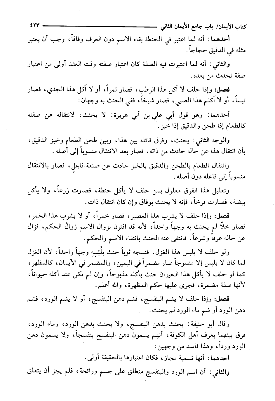 وَقَالَ أَبُو حَنِيفَةَ: يَحْنَثُ بِدُهْنِ الْبَنَفْسَجِ، وَلَا يَحْنَثُ بِدُهْنِ الْوَرْدِ، وَمَاءِ الْوَرْدِ، فَرَّقَ بَيْنَهُمَا بِعُرْفِ أَهْلِ الْكُوفَةِ، أَنَّهُمْ يُسَمُّونَ دُهْنَ الْبَنَفْسَجَ بَنَفْسَجًا، وَلَا يُسَمُّونَ دُهْنَ الْوَرْدِ وَرْدًا، وَهَذَا فَاسِدٌ مِنْ وَجْهَيْنِ:
