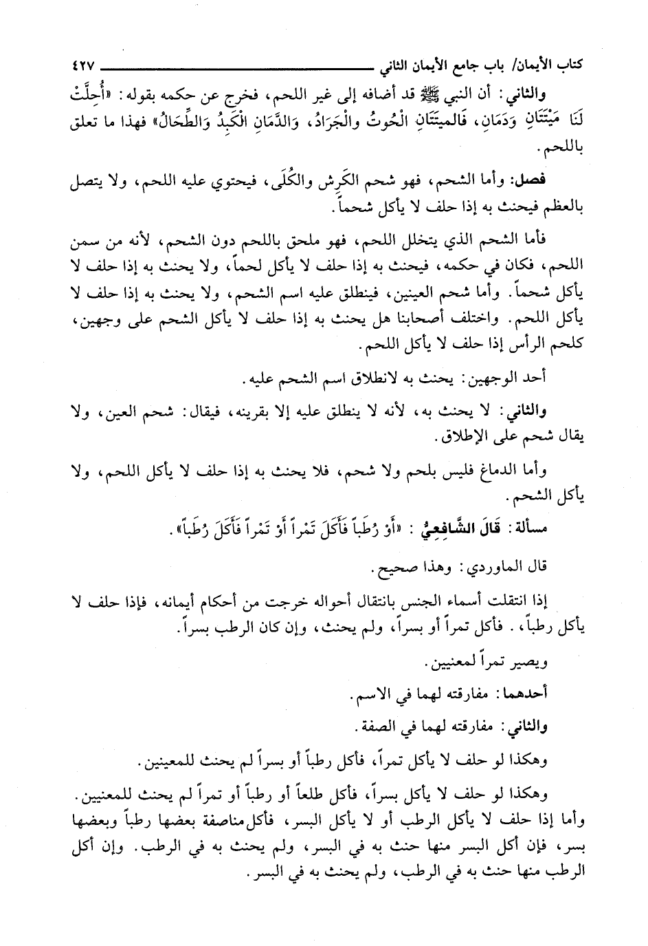 فَأَمَّا الشَّحْمُ الَّذِي يَتَخَلَّلُ اللَّحْمَ، فَهُوَ مُلْحَقٌ بِاللَّحْمِ دُونَ الشَّحْمِ، لِأَنَّهُ مِنْ سِمَنِ اللَّحْمِ، فَكَانَ فِي حُكْمِهِ، فَيَحْنَثُ بِهِ إِذَا حَلَفَ لَا يَأْكُلُ لَحْمًا، وَلَا يَحْنَثُ بِهِ إِذَا حَلَفَ لَا يَأْكُلُ شَحْمًا. وَأَمَّا شَحْمُ الْعَيْنَيْنِ، فَيَنْطَلِقُ عَلَيْهِ اسْمُ الشَّحْمِ، وَلَا يَحْنَثُ بِهِ إِذَا حَلَفَ لَا يَأْكُلُ اللَّحْمَ. وَاخْتَلَفَ أَصْحَابُنَا هَلْ يَحْنَثُ بِهِ إِذَا حَلَفَ لَا يَأْكُلُ الشَّحْمَ عَلَى وَجْهَيْنِ، كَلَحْمِ الرَّأْسِ إِذَا حَلَفَ لَا يَأْكُلُ اللَّحْمَ.