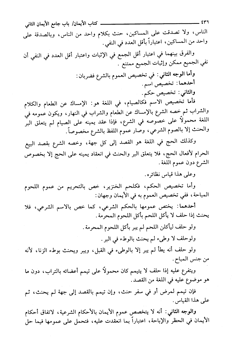 وَالْوَجْهُ الثَّانِي: إنَّهُ لَا يَتَخَصَّصُ عُمُومُ الْأَيْمَانِ بِالْأَحْكَامِ الشَّرْعِيَّةِ، لِاتِّفَاقِ أَحْكَامِ الْأَيْمَانِ فِي الْحَظْرِ وَالْإِبَاحَةِ، اعْتِبَارًا بِمَا انْعَقَدَتْ عَلَيْهِ، فَتُحْمَلُ عَلَى عُمُومِهَا فِيمَا حَلَّ